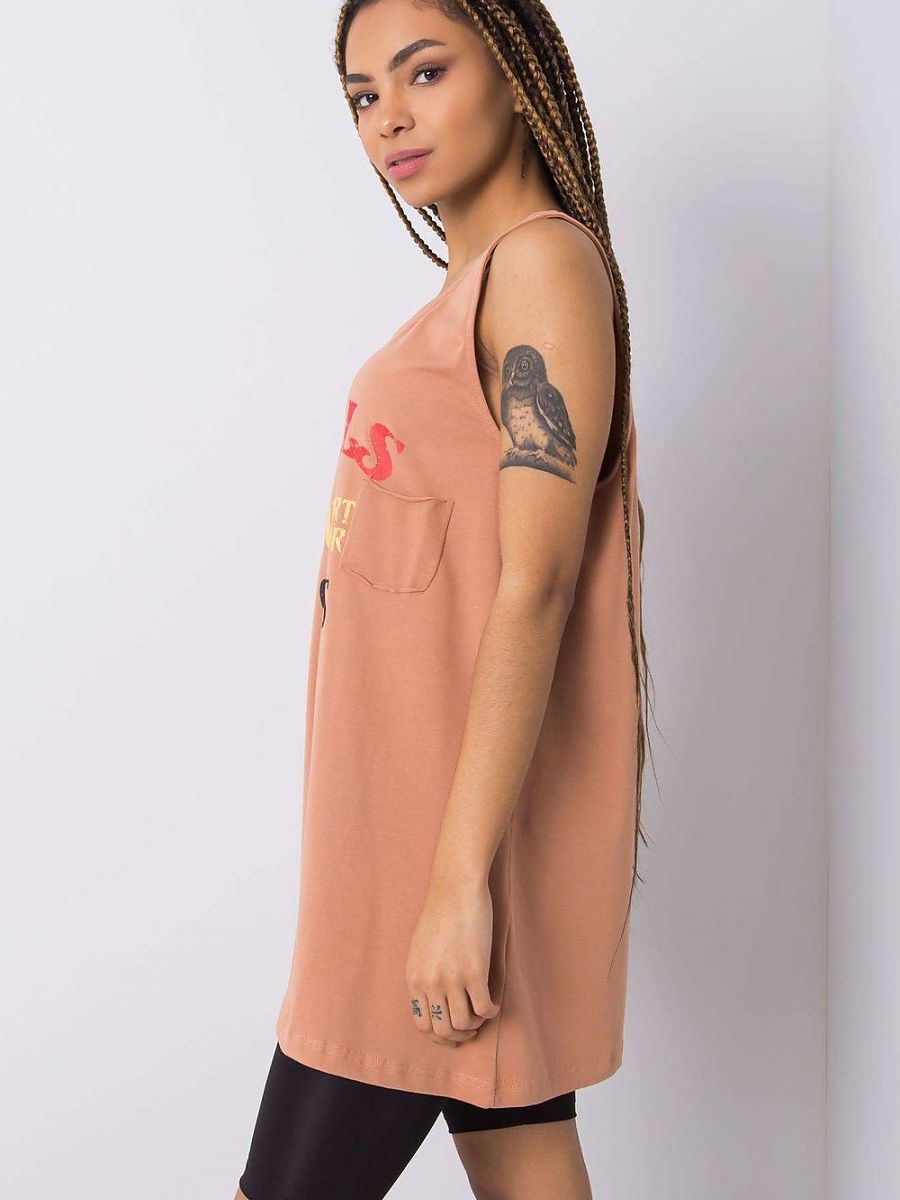 Koszulka o przedłużanym kroju, bez rękawków oraz okrągłym dekoltem. Na przodzie ozdobny napis.