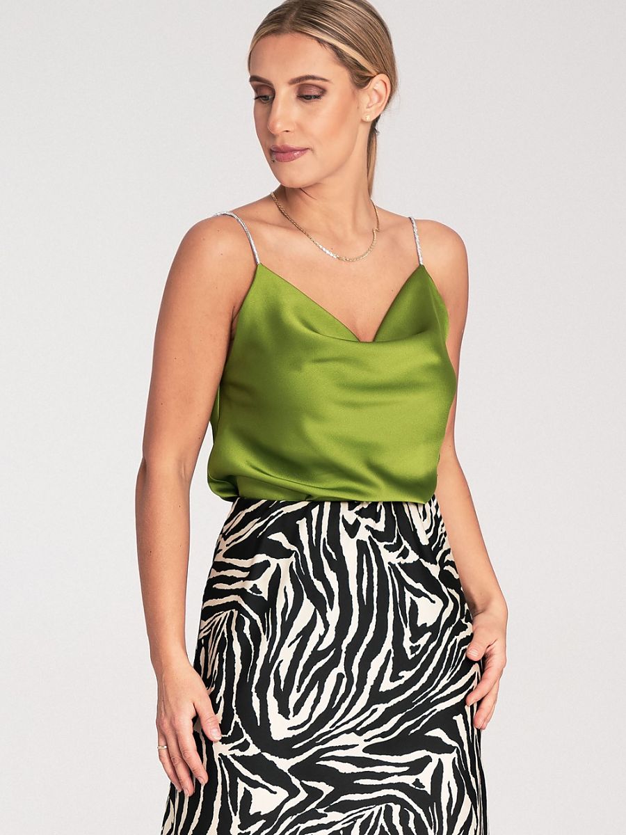 Satynowy top z błyszczącymi, kryształowymi ramiączkami. Lejący dekolt typu woda.