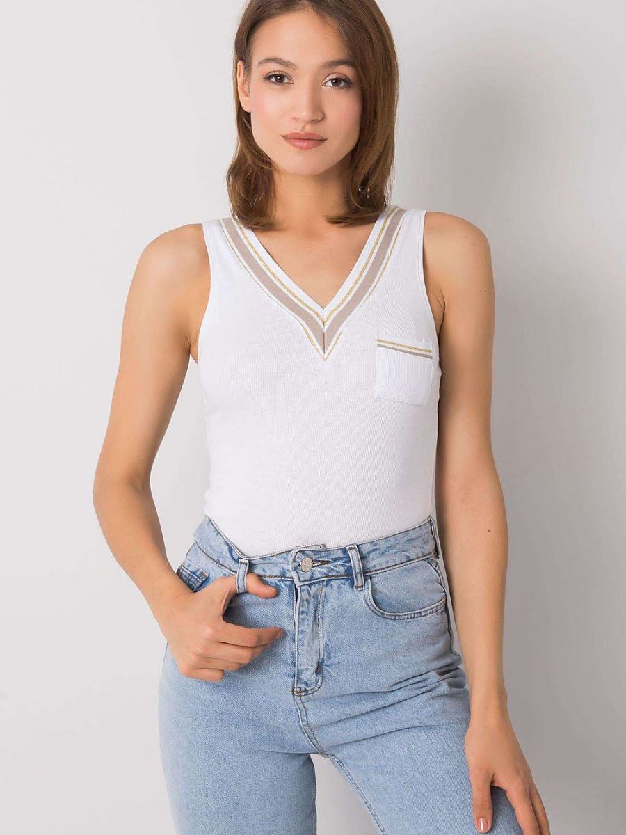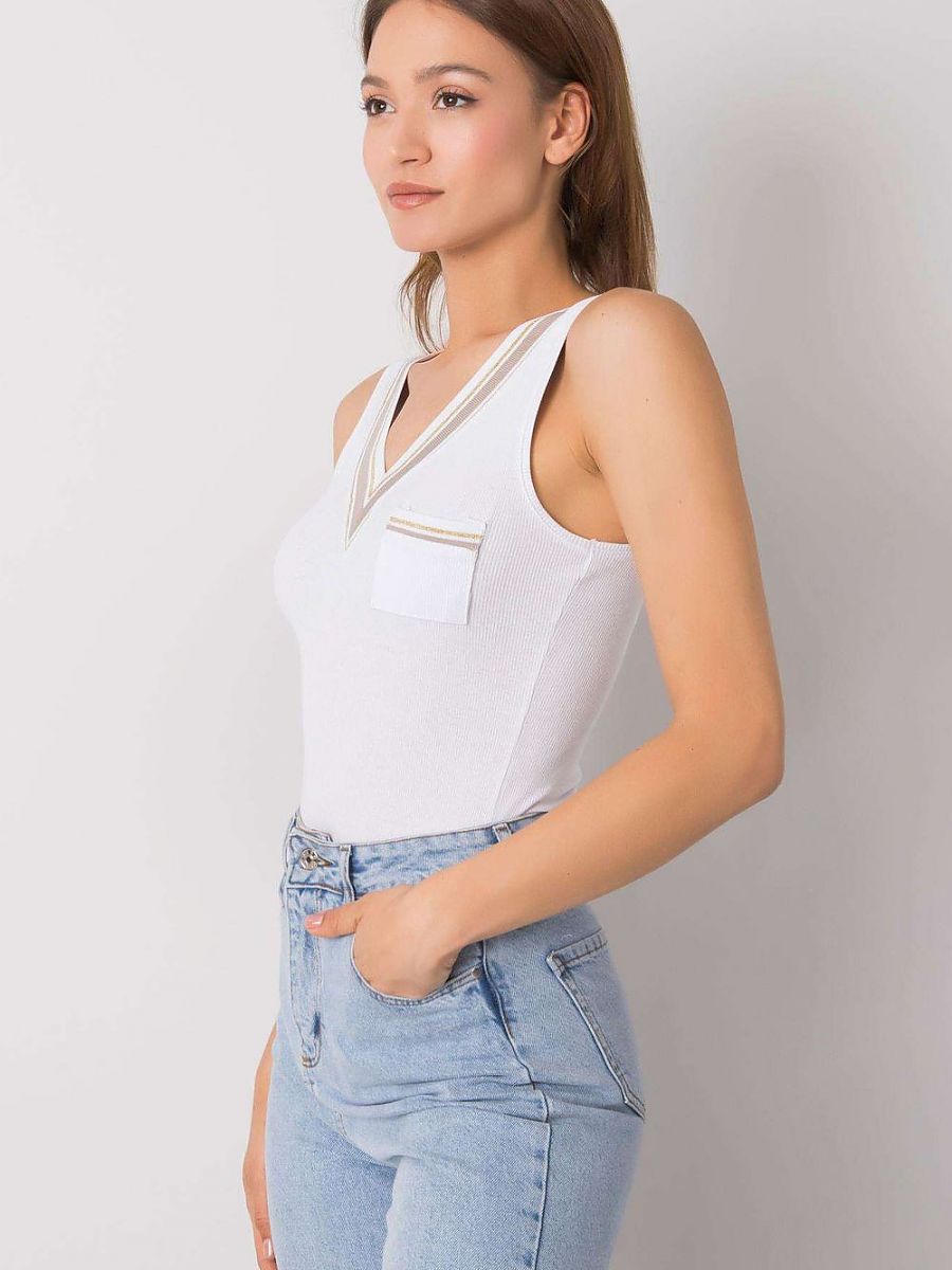 Koszulka bez rękawków z dekoltem w serek. Na przodzie ozdobna kieszonka.