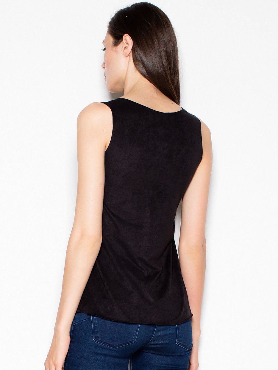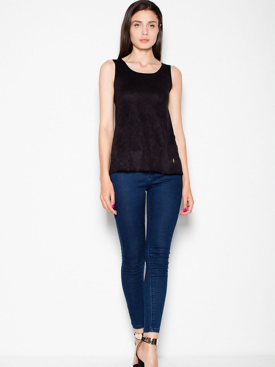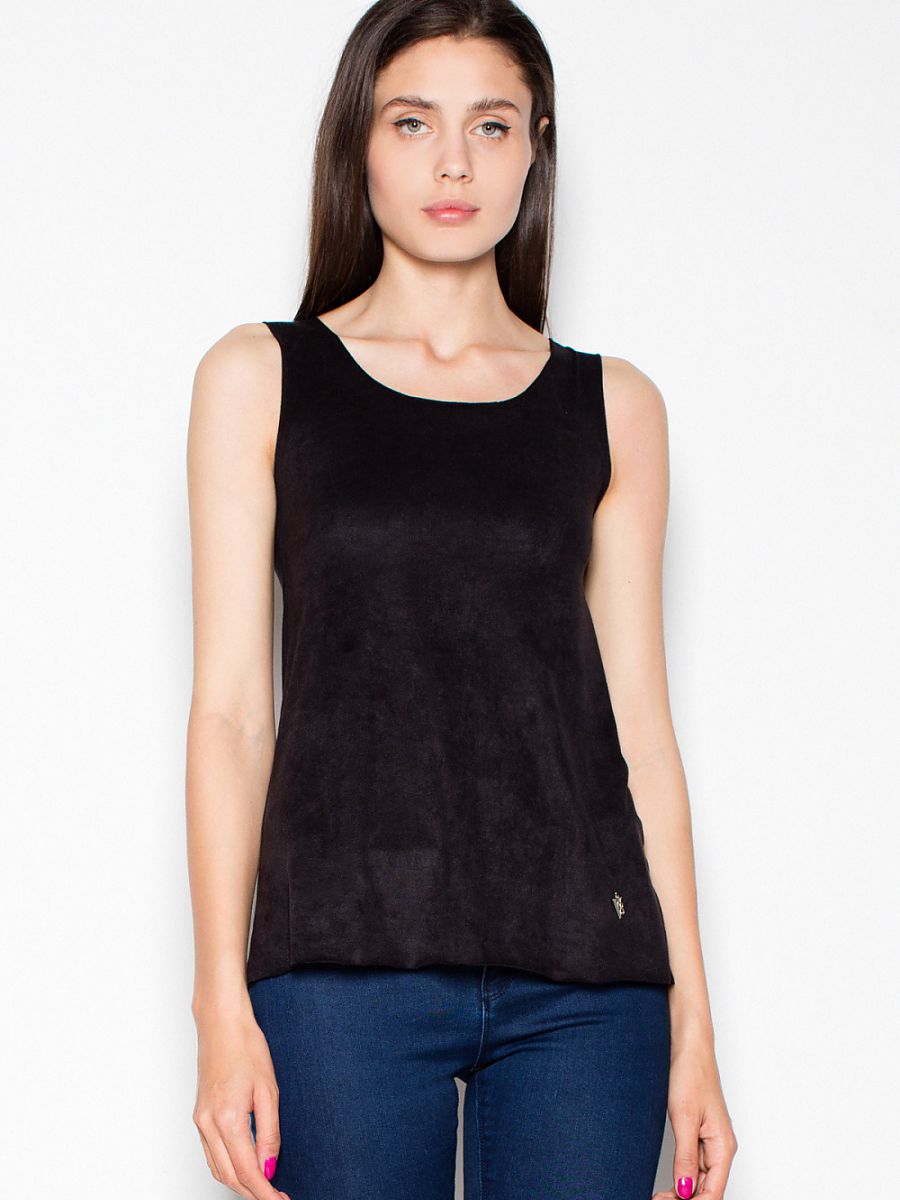 Lekka zamszowa bluzka na ramiączkach z półokrągłym dekoltem. Model o luźnym kroju, świetny do codziennych stylizacji.