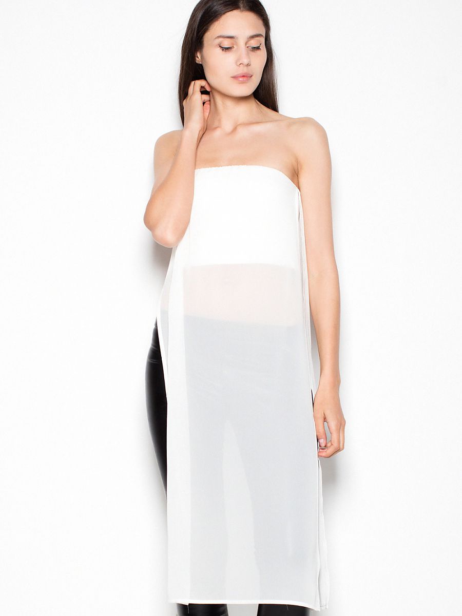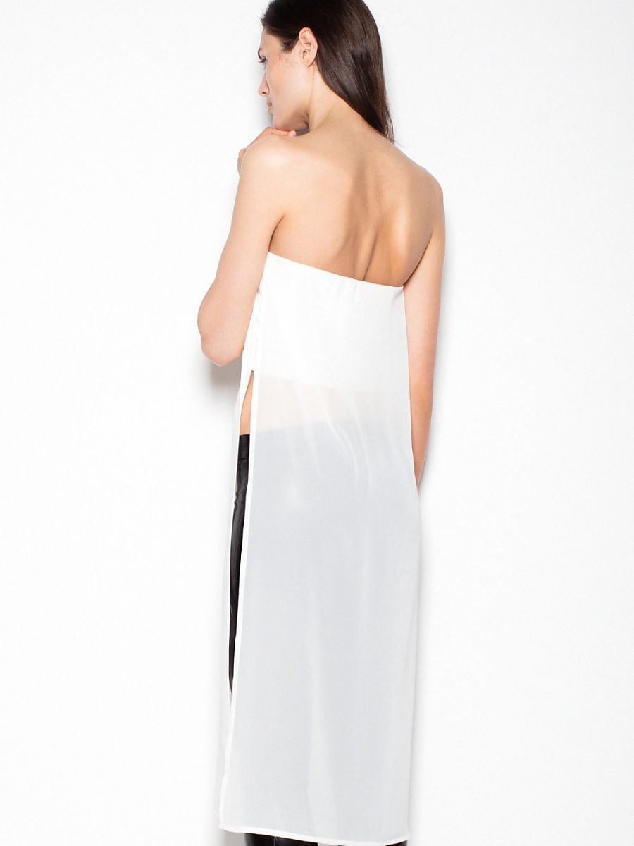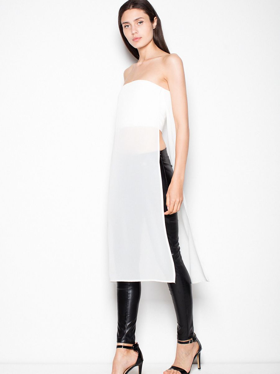 Ekstrawagancki top bez ramiączek przedłużany ozdobnym szyfonem. Po bokach posiada wcięcia. Model o oryginalnym kroju, dobrze prezentuje się z dopasowanymi legginsami.