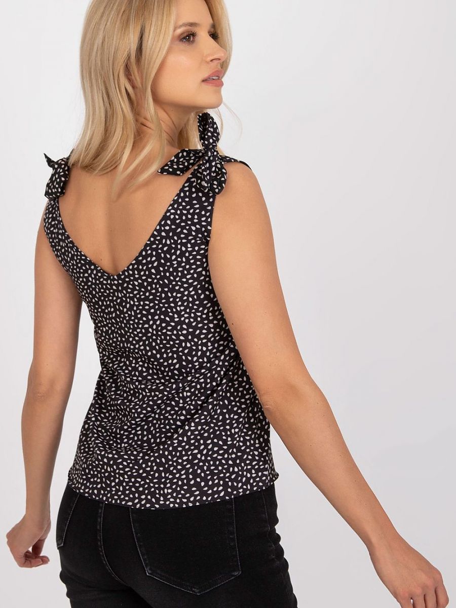 Top o prostym kroju z dekoltem w serek. Ramiączka topu z ozdobnymi wiązaniami. Propozycja idealna na wiele okazji.