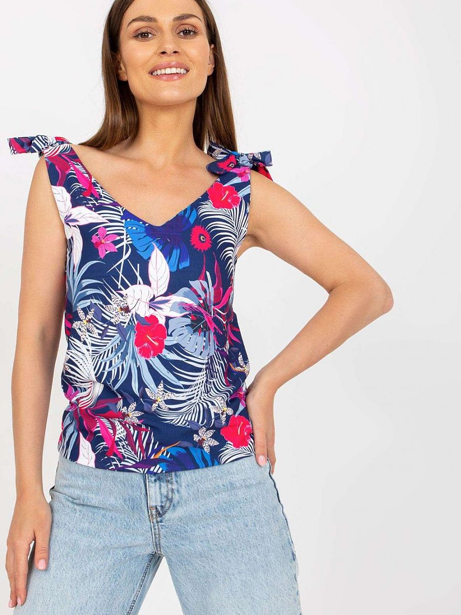 Top o prostym kroju z dekoltem w serek. Ramiączka topu z ozdobnymi wiązaniami. Propozycja idealna na wiele okazji.