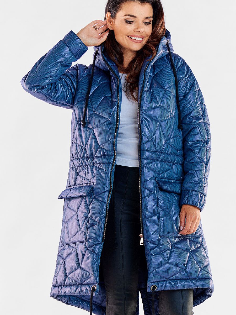 Pikowana kurtka o długości przed kolano, przedłużonym tyłem z kapturem i prostymi rękawami. Poszerzana ku dołowi, ze ściągaczem na wysokości talii, zapinana na zamek. Sprawdzi się jako kurtka przeciwdeszczowa. Kurtka w całości na podszewce. Kurtka zaprojektowana i uszyta w Polsce.