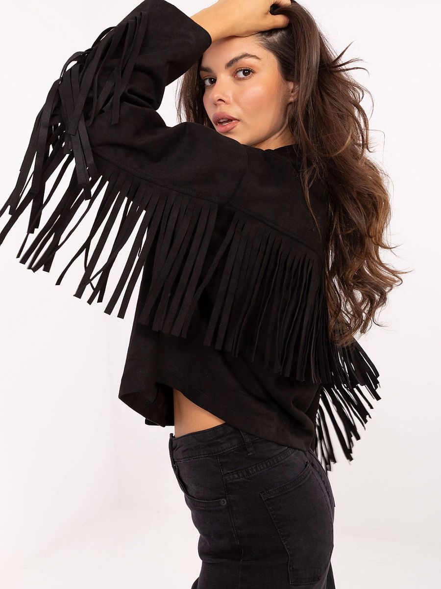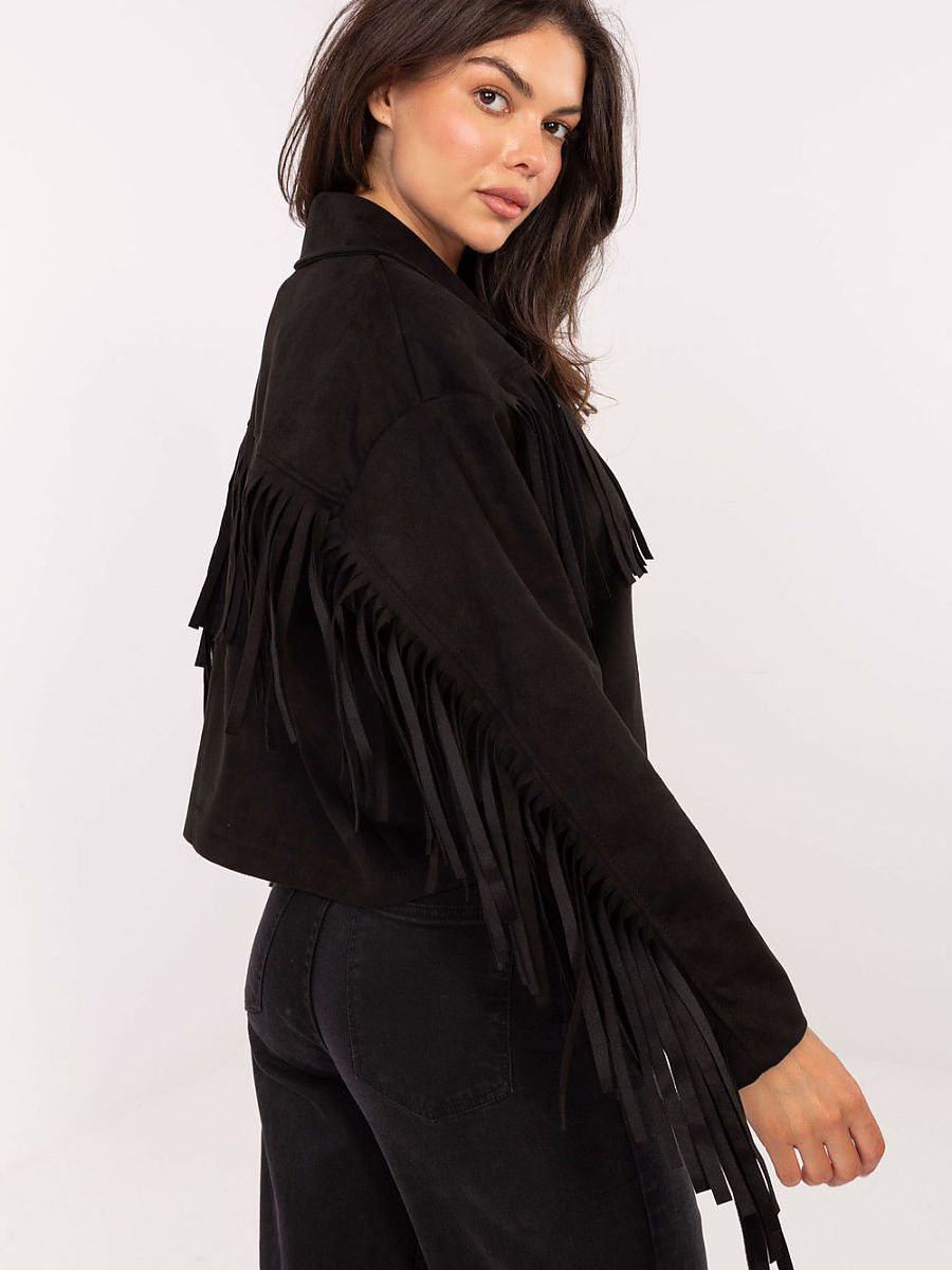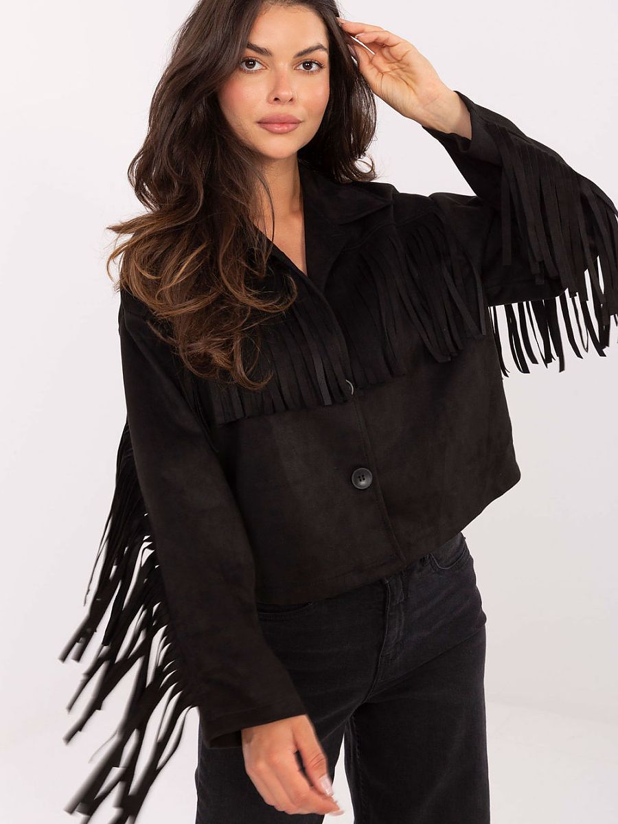 Krótka damska kurtka przejściowa o casualowym charakterze, idealna na codzienne stylizacje. Wykonana z połączenia poliestru i elastanu, zapewnia wygodę i swobodę ruchów. Gładka tkanina została urozmaicona modnymi frędzlami na rękawach, plecach oraz przodzie, co nadaje całości wyjątkowego, stylowego wyrazu. Model z długim rękawem, zapinany na guziki. Kurtka bez ocieplenia, doskonała na sezon jesień, zima oraz wiosna. To efektowny element garderoby, który ożywi każdą codzienną stylizację.