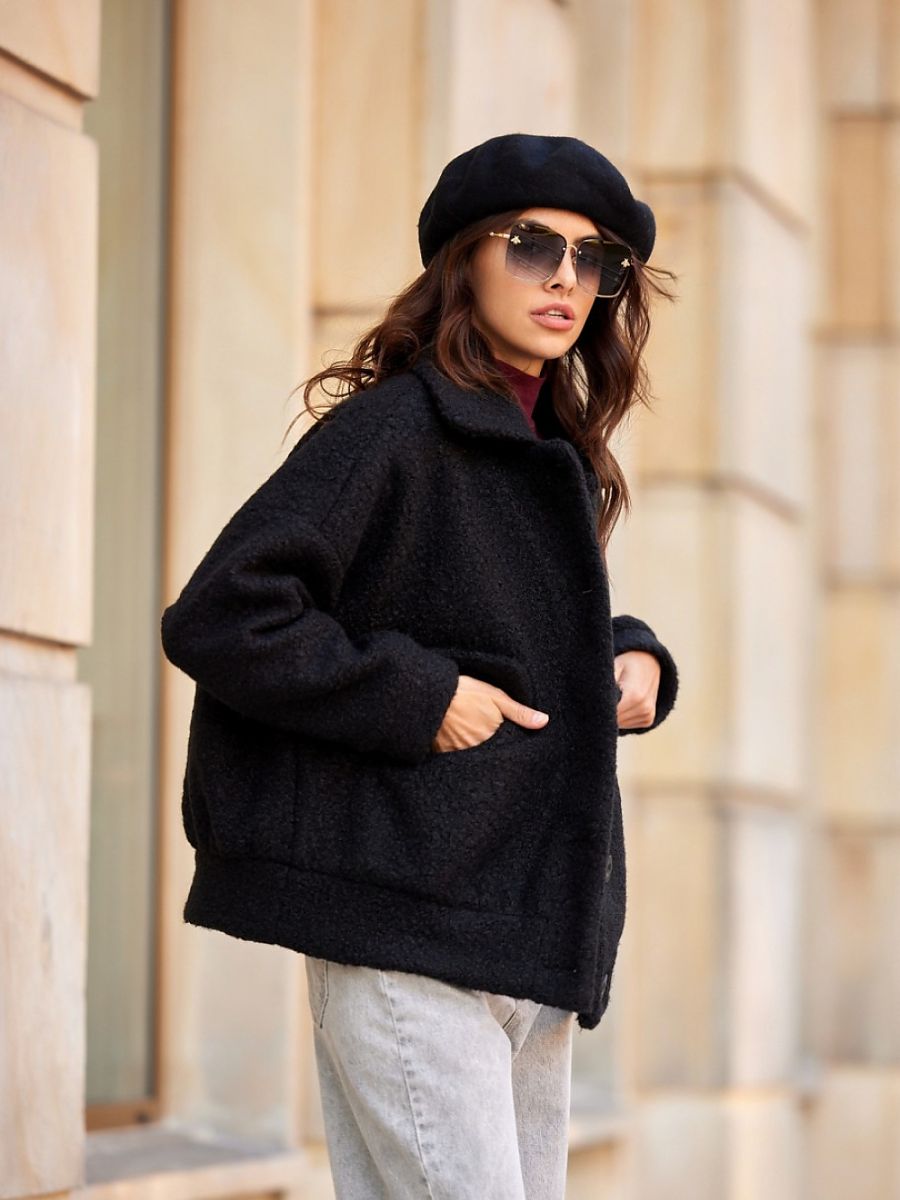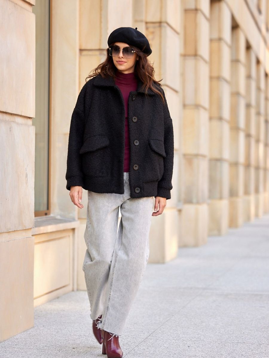 Kurtka została wykonana z modnego materiału typu baranek, który gwarantuje ciepło i stylowy wygląd. Pikowana Podszewka zapewnia dodatkowy komfort i ciepło niezależnie od pogody. Na spacerze w parku, czy w drodze do pracy, kurtka Ivon zapewni Ci ciepło. Klasyczne zapięcie na guziki dodaje kurtce eleganckiego charakteru, a jednocześnie sprawia, że możesz swobodnie regulować jej fason. Duże klapowe kieszenie dodają funkcjonalności i wyjątkowego stylu. Przechowuj wszystkie swoje drobiazgi w pojemnych kieszeniach, które nie tylko są praktyczne, ale również stanowią modny akcent. Elegancki kołnierzyk nadaje całości wyjątkowego szyku, sprawiając, że kurtka idealnie sprawdzi się zarówno w casualowych, jak i bardziej formalnych zestawieniach. Kurtka Ivon to must-have tego sezonu! Stwórz niepowtarzalne stylizacje, łącząc ją z ulubionymi jeansami, spodniami materiałowymi czy zwiewnymi sukienkami. Kurtka nada się na jesienne spacery do parku oraz wyjście z przyjaciółką na kawę do kawiarni. Produkt jest wyprodukowany i uszyty w Polsce.