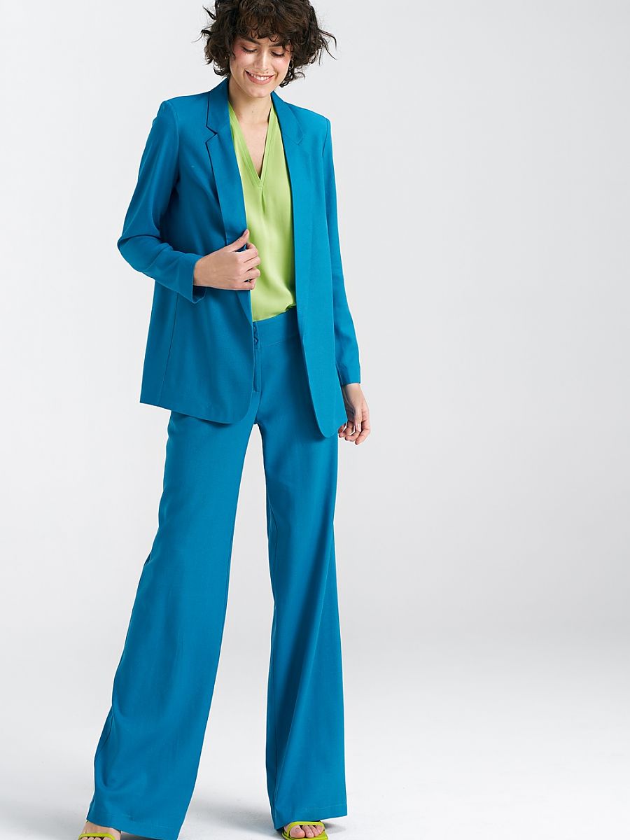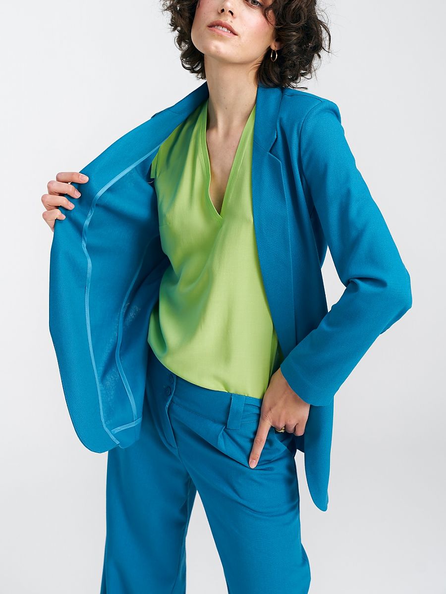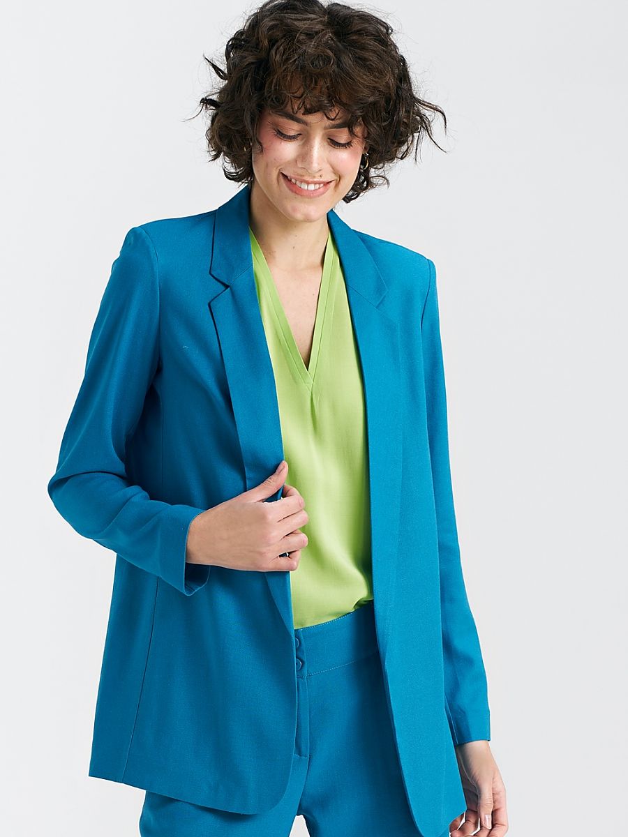 Marynarka damska o kroju regularnym i luźnym to doskonała propozycja dla kobiet ceniących swobodę i wygodę w noszeniu. Wykonana z wysokiej jakości materiału, który zawiera wiskozę, len i bawełnę, zapewnia komfort noszenia oraz przyjemny dotyk na skórze. W eleganckim odcieniu niebieskim, znakomitym capri blue, marynarka ta dodaje stylu i świeżości każdemu outfitowi. Charakteryzują ją wykładane klapy, które nadają jej wyrafinowanego charakteru. Bez zapięcia, jest wygodnym i szykownym elementem garderoby, idealnym zarówno do formalnych, jak i bardziej swobodnych stylizacji. Poduszki na ramionach nadają strukturę i dodają subtelności sylwetce, tworząc harmonijny wygląd. Marynarka ta nie posiada podszewki, co sprawia, że jest lekka i idealna na cieplejsze dni. Szwy wewnętrzne są starannie lamowane, co podkreśla wysoką jakość wykonania oraz dbałość o detale. To doskonały wybór dla kobiet, które cenią sobie zarówno elegancję, jak i wygodę w codziennym noszeniu.