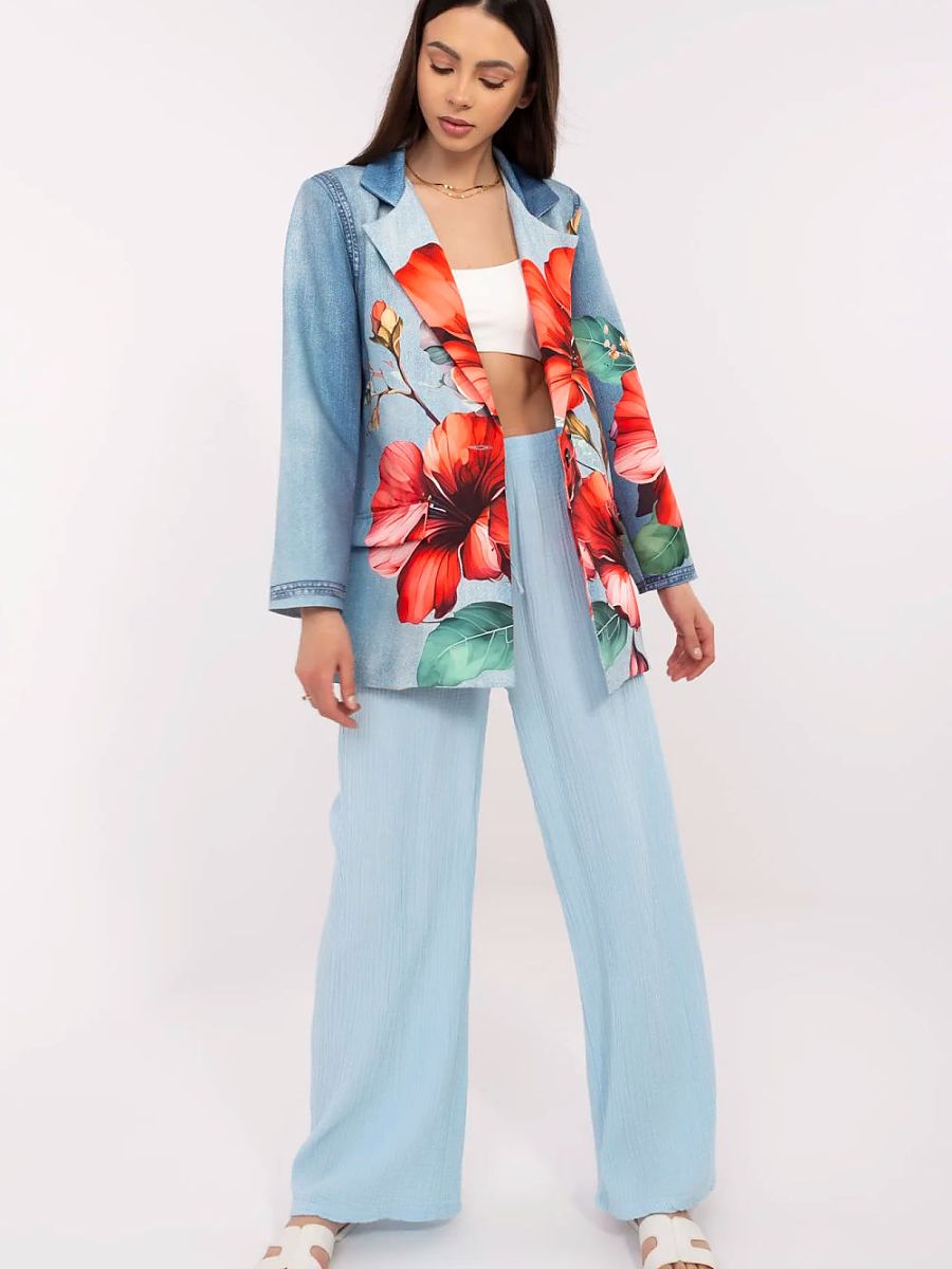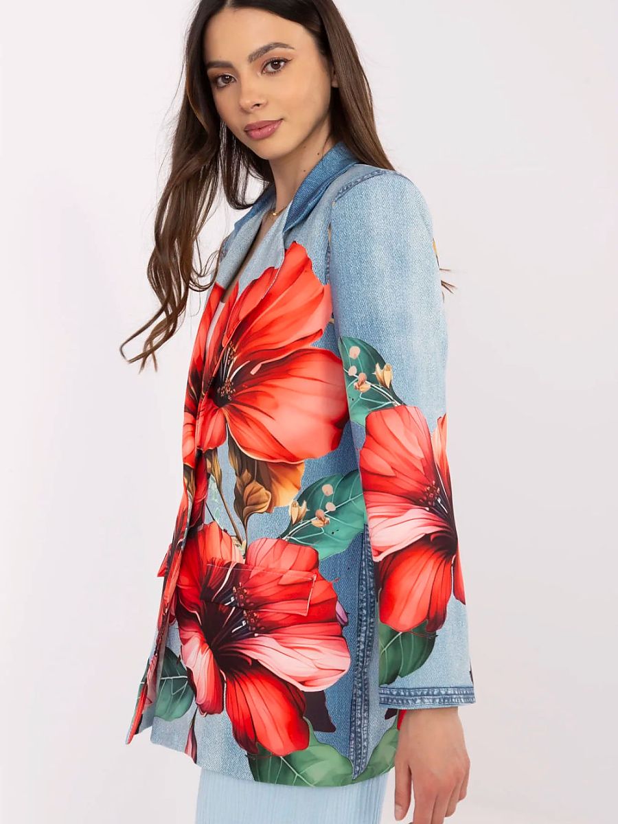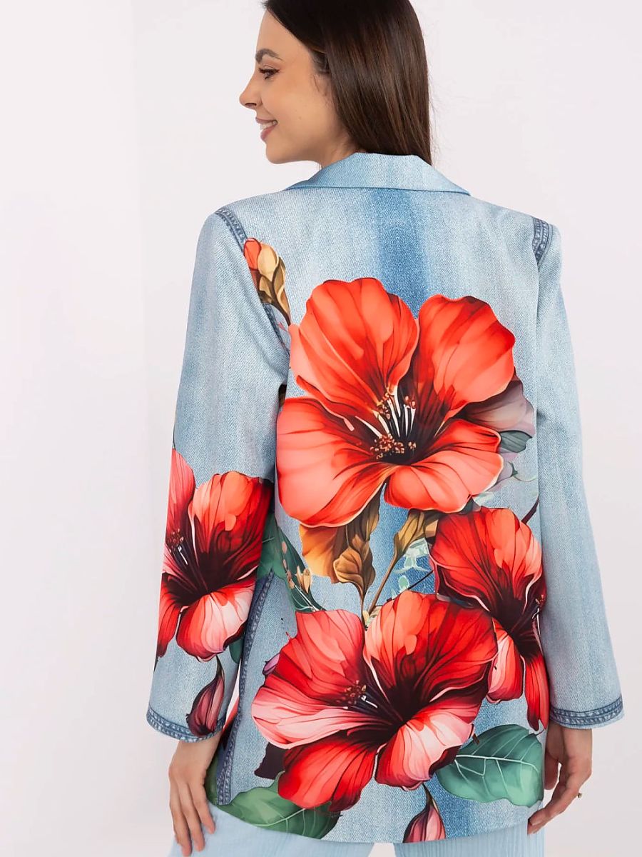 Casualowa marynarka damska z imitacji jeansu to idealne połączenie stylu i wygody. Wykonana z lekkiej mieszanki wiskozy i poliestru, doskonale sprawdzi się w sezonie wiosna/lato. Standardowa długość i długi rękaw nadają jej uniwersalnego charakteru, a jednorzędowe zapięcie na guzik podkreśla klasyczny fason. Delikatny kwiatowy nadruk dodaje kobiecego uroku, czyniąc ją świetnym wyborem na co dzień. Marynarka posiada wszyte poduszki na ramionach, które subtelnie modelują sylwetkę, oraz podszewkę dla większego komfortu noszenia. Idealna do casualowych stylizacji, świetnie komponuje się zarówno ze spodniami, jak i spódnicami.