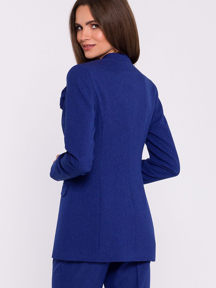 Elegancka damska marynarka z tkaniny o taliowanym kroju, podkreślającym sylwetkę. Bez kołnierza, zapinana na jeden guzik, co nadaje jej nowoczesnego i minimalistycznego charakteru. Na piersi znajduje się ozdobny, dopinany kwiatek, który dodaje marynarce unikalnego i kobiecego akcentu. Kieszenie z klapkami wprowadzają praktyczność i styl. Marynarka jest w całości na podszewce, co zapewnia komfort noszenia i doskonałe wykończenie. Zaprojektowana i uszyta w Polsce, to idealny wybór dla kobiet ceniących elegancję z nutą oryginalności.