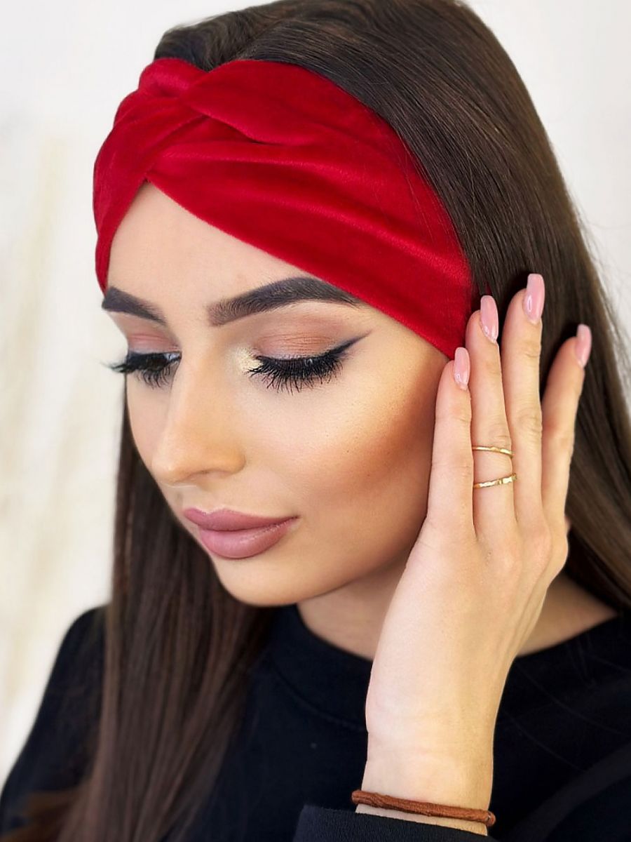 Modna opaska na głowę, idealne uzupełnienie jesienno-zimowych stylizacji. Uszyta z przyjemnego w dotyku miękkiego weluru, który doskonale dopasowuje się do obwodu głowy. Z przodu ozdobne przeplatanie z węzłem. Opaska zaprojektowana i uszyta w Polsce.