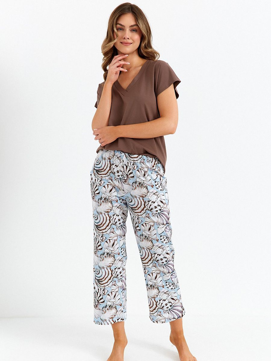 Nowoczesna i wygodna piżama damska zaprojektowana z myślą o codziennym komforcie. Bluzka z krótkim rękawem i dekoltem w kształcie litery V subtelnie podkreśla kobiecą sylwetkę, a luźny krój zapewnia pełną swobodę ruchów. Model wyposażony jest w praktyczne kieszenie, które dodają funkcjonalności. Do kompletu dołączone są spodnie o długości 7/8 z efektownym nadrukiem. Elastyczna gumka w pasie gwarantuje idealne dopasowanie i wygodę podczas noszenia. To doskonały wybór dla kobiet ceniących połączenie stylu i komfortu.