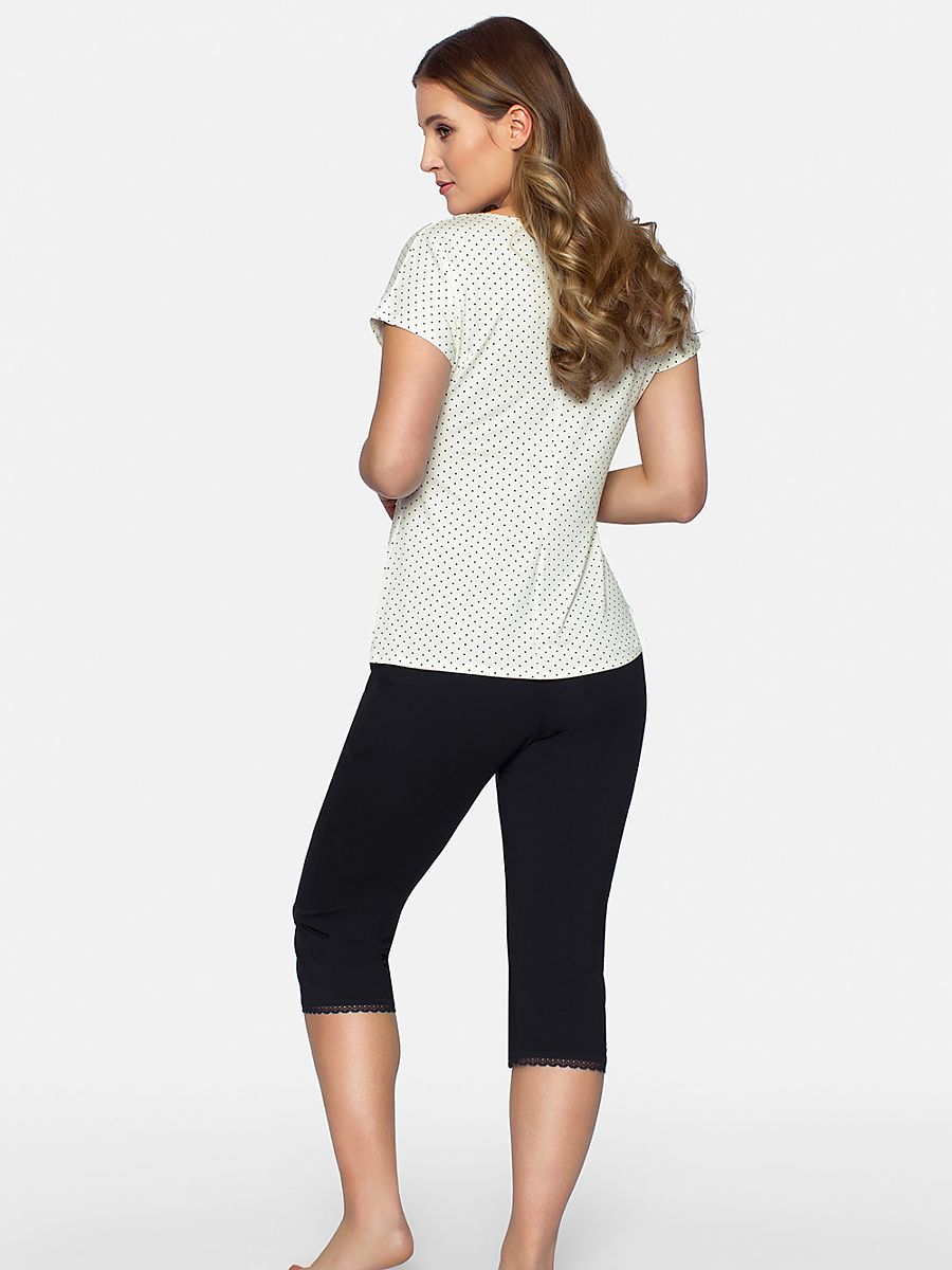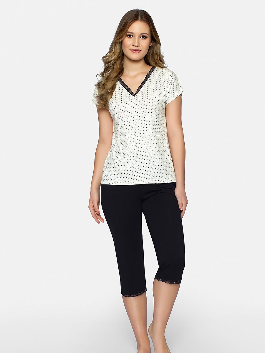 Wygodna piżama damska Cleo. Pastelowa bluzka z miękkiej drukowanej wiskozy, przyjemnie układa się na ciele. Dekolt zdobi wąska, elegancka koronka. Do kompletu dopasowano spodnie o praktycznej długości 3/4 w kolorze czarnym. Całość tworzy klasyczny, stonowany zestaw.