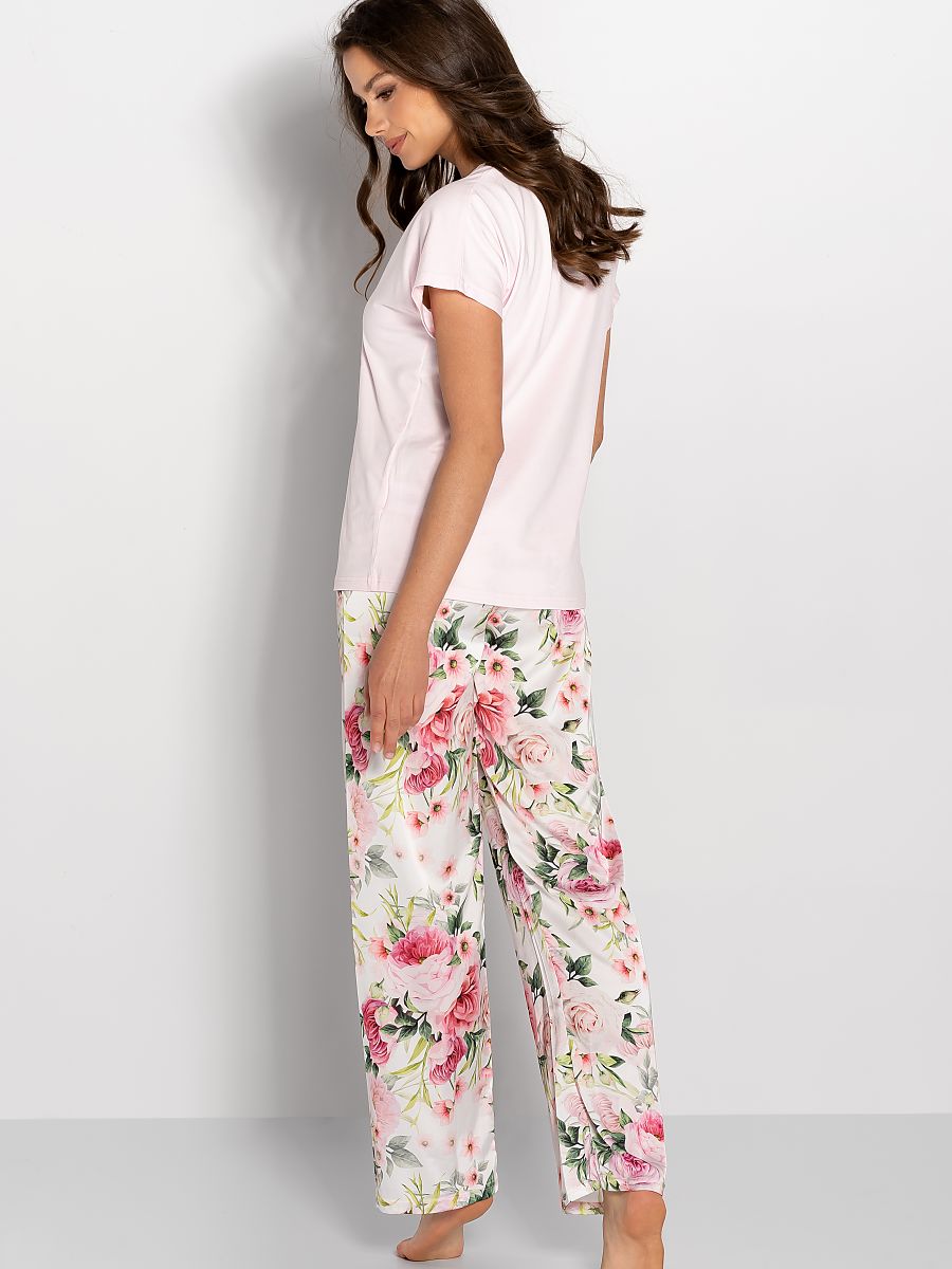 Piżama damska składająca się z bluzki i spodni. Koszulka z krótkim rękawkiem oraz dekoltem w serek. Długie spodnie z nadrukiem o luźnym, komfortowym kroju z ozdobną kokardką.