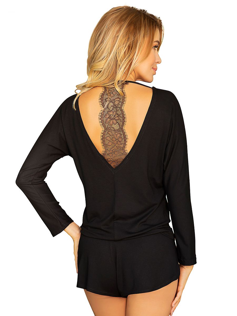 Uroczy dwuczęściowy komplet wiskozowy Chalandri. Górę stanowi bluzka z długim rękawem, której przód jest gładki, natomiast tył powstał dzięki połączeniu koronki oraz wiskozy. W komplecie znajdują się szorty, których boki nogawek nakładają się na siebie. Wygodny, niezobowiązujący komplet do spania na co dzień i na większe okazje.