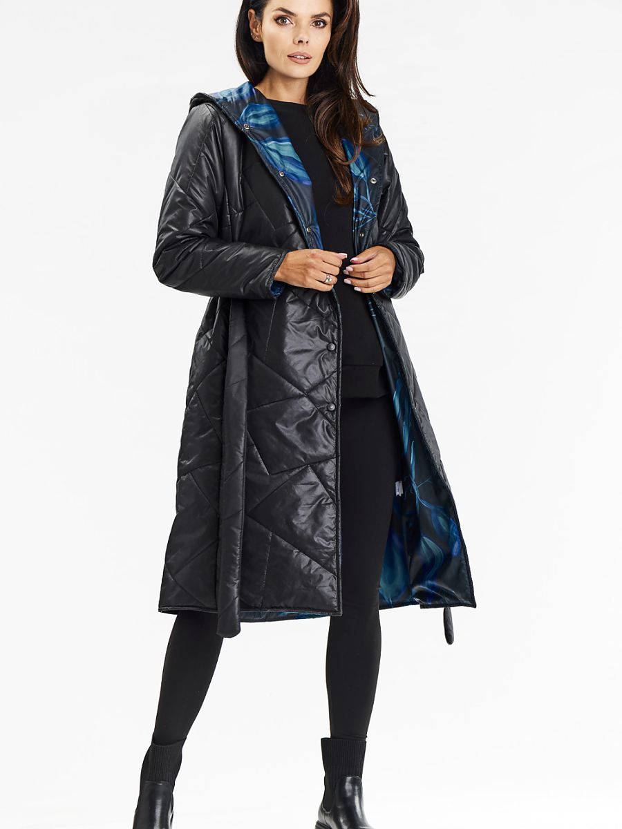 Długi płaszcz z kapturem oraz długim rękawem zapinany na napy w kolorze czarnym. Elegancki i funkcjonalny długi płaszcz z kapturem od marki Awama to doskonały wybór na jesień i zimę. Wykonany z ciepłej pikówki, zapewnia komfort w chłodniejsze dni. Pasek w talii podkreśla sylwetkę, a oryginalna podszewka w print kolorowych liści dodaje unikalnego charakteru. Idealny na co dzień, łączy elegancję z casualowym stylem.
