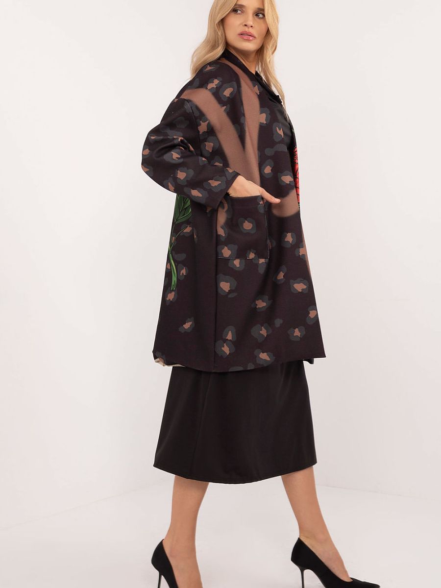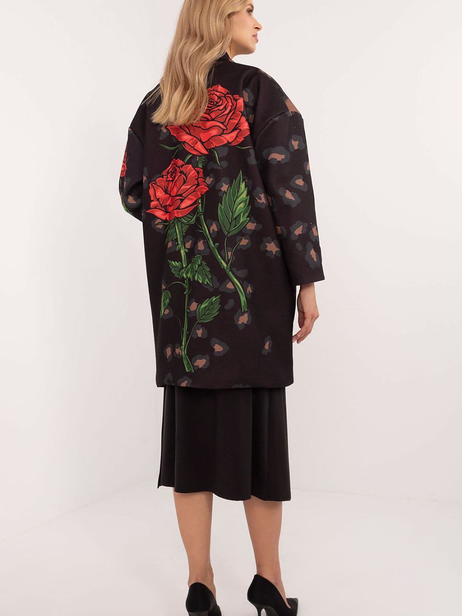 Damski płaszcz przejściowy bez zapięcia, doskonały na codzienne wyjścia oraz do pracy, w stylu casual. Płaszcz wykonany jest z lekkiego materiału bez ocieplenia, co sprawia, że idealnie nadaje się na sezon jesienno-zimowy oraz wiosenny. Ozdobiony efektownym nadrukiem róż na łodygach, który dodatkowo podkreślają subtelne dżety, nadaje całości wyjątkowego, eleganckiego charakteru. Standardowa długość oraz długie rękawy zapewniają wygodę, a wsuwane kieszenie dodają funkcjonalności. Płaszcz wyposażony w podszewkę, która zapewnia komfort noszenia i doskonale sprawdza się na co dzień, łącząc styl z wygodą i oryginalnością.