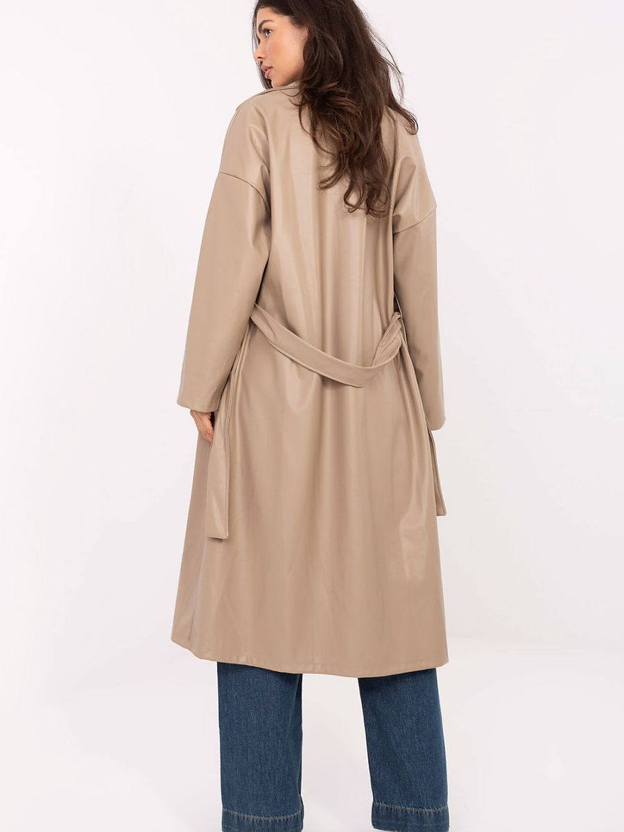 Damski płaszcz skórzany o ponadczasowym, casualowym charakterze, idealny jako przejściowe okrycie wierzchnie na jesień, zimę i wiosnę. Wykonany z wysokiej jakości mieszanki poliestru i poliuretanu, wyróżnia się gładką fakturą i eleganckim wyglądem. Model o długości za kolano został zaprojektowany z dbałością o detale: posiada klasyczne wykładane klapy, wsuwane kieszenie oraz długi rękaw. Dwurzędowe zapięcie na guziki nadaje mu szyku, a pasek do wiązania w talii pozwala podkreślić sylwetkę i dopasować fason do własnych preferencji. Lekki, bez ocieplenia, świetnie sprawdzi się w codziennych stylizacjach, łącząc wygodę z modnym, ponadczasowym designem. To uniwersalny płaszcz, który doda klasy każdemu outfitowi.