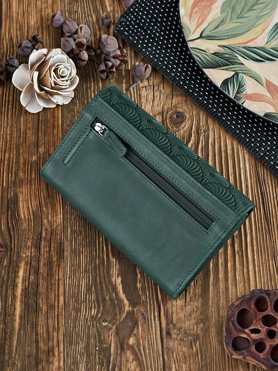 Portfel IN57 został wykonany z wysokojakościowej skóry naturalnej, tłoczonej na froncie w geometryczny wzór. We wnętrzu umieszczono kieszonkę zapinaną na solidną napę, mieszczącą bilon oraz trzy przegrody na banknoty. Do dyspozycji jest 8 miejsc na karty i transparentną przegródkę na legitymację czy zdjęcia bliskich. Dodatkowe miejsce do przechowywania stanowi pięć schowków, w tym dwa na odwrocie portfela na suwak oraz po długości. Portfel wyposażony w ochronną warstwę RFID.