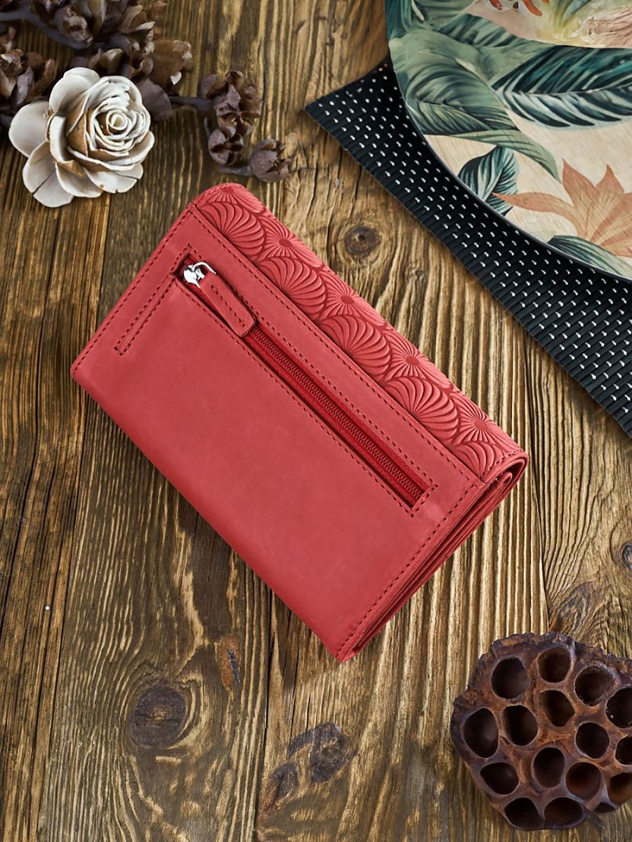Portfel IN57 został wykonany z wysokojakościowej skóry naturalnej, tłoczonej na froncie w geometryczny wzór. We wnętrzu umieszczono kieszonkę zapinaną na solidną napę, mieszczącą bilon oraz trzy przegrody na banknoty. Do dyspozycji jest 8 miejsc na karty i transparentną przegródkę na legitymację czy zdjęcia bliskich. Dodatkowe miejsce do przechowywania stanowi pięć schowków, w tym dwa na odwrocie portfela na suwak oraz po długości. Portfel wyposażony w ochronną warstwę RFID.