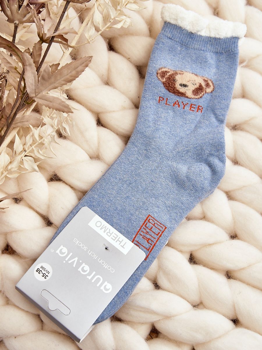 Ciepłe skarpety damskie idealne na mroźne dni. Model z naszywką w postaci misia. Lekki ściągacz sprawi, że będą idealnie dopasowane do tęgości nogi. Koniecznie powinnaś je mieć!