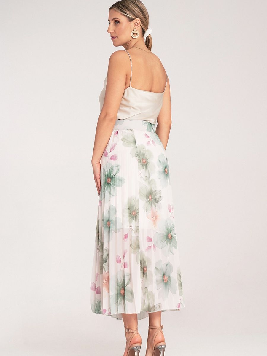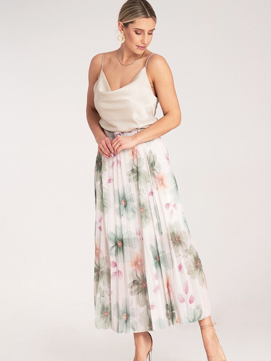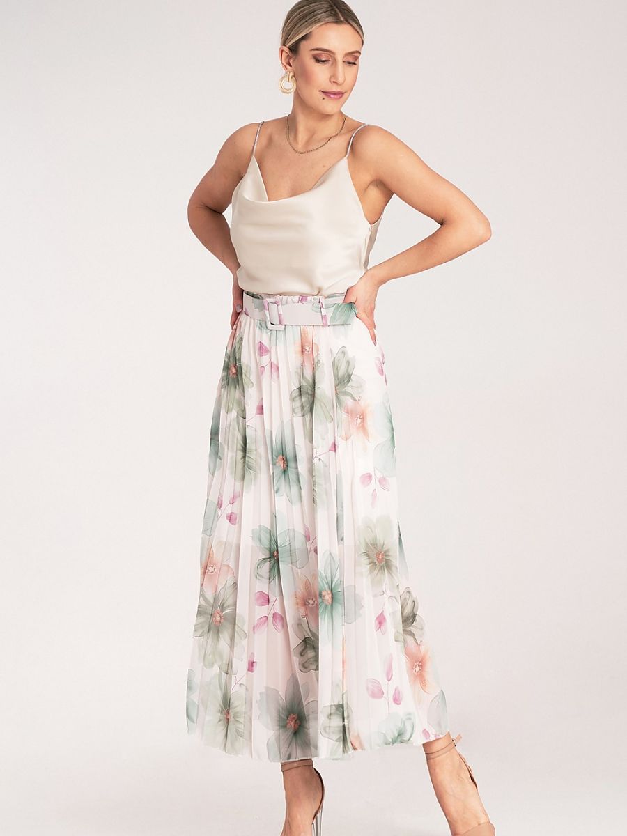 Plisowana spódnica midi w kwiatowy wzór. Wysoki stan z dopasowanym paskiem podkreśla talię, a zwiewny materiał dodaje lekkości i elegancji. Wiskozowa podszewka.