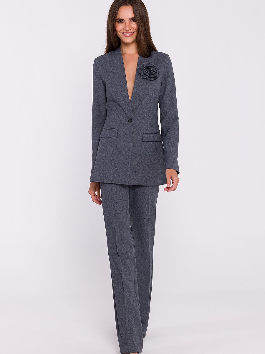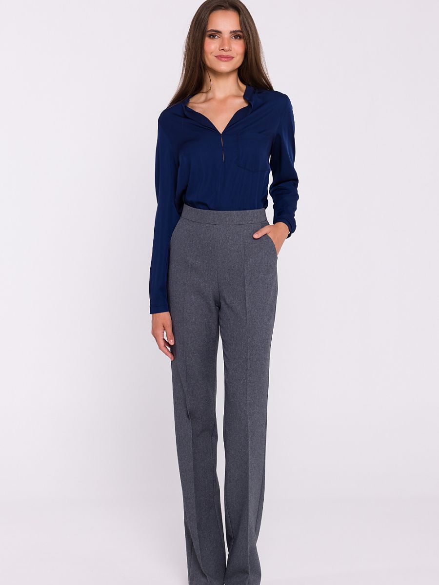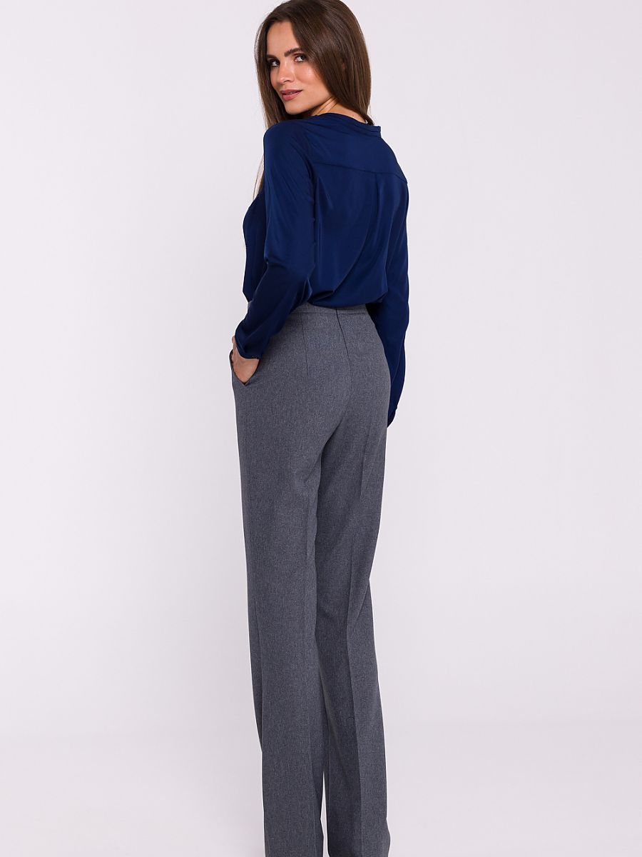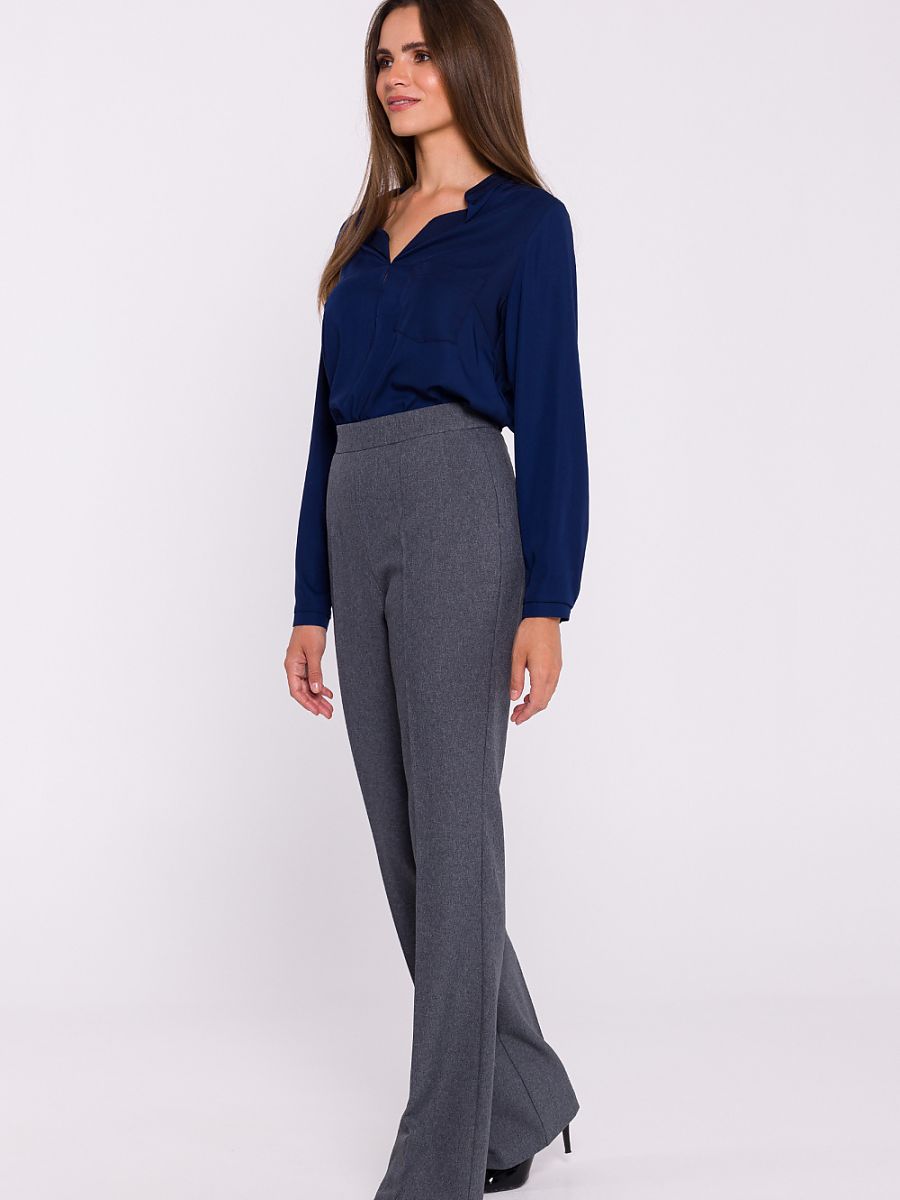 Eleganckie damskie spodnie z tkaniny, wyróżniające się rozszerzanymi nogawkami u dołu, które dodają sylwetce lekkości i wydłużają nogi. Zaprasowanie na kant podkreśla ich klasyczny i wyrafinowany charakter, idealny zarówno do pracy, jak i na formalne okazje. Spodnie mają wysoki stan, który pięknie podkreśla talię, a kryty zamek z tyłu zapewnia gładkie, dyskretne zapięcie. Zaprojektowane i uszyte w Polsce, łączą w sobie doskonałe wykonanie z modnym, kobiecym fasonem.