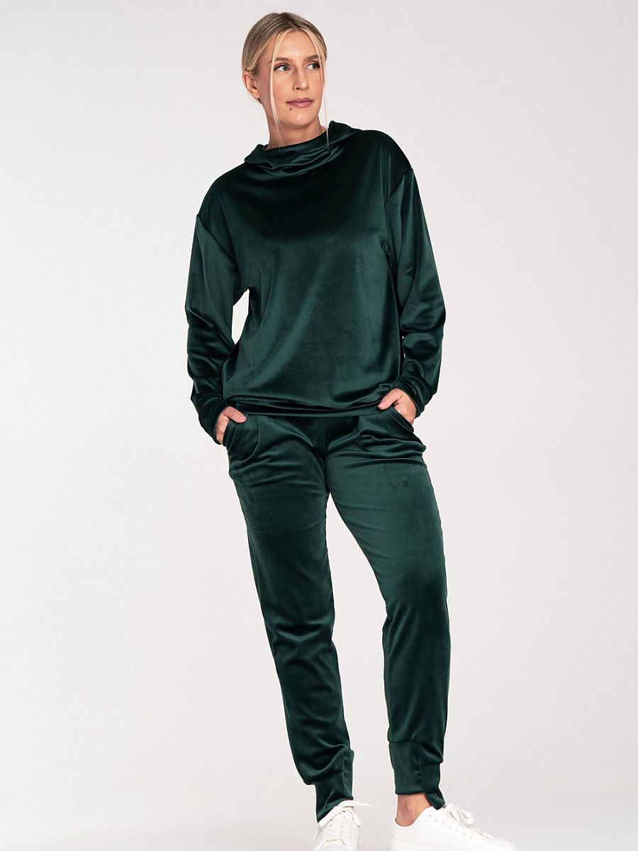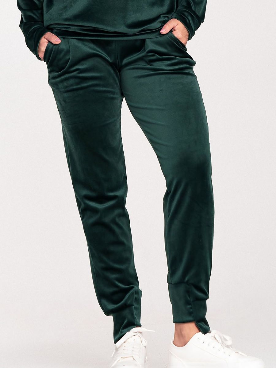 Zielone welurowe spodnie dresowe z kieszeniami. Ściągacz w pasie bez wiązania. Nogawki zwężane do dołu wykończone asymetrycznie ściągaczem.