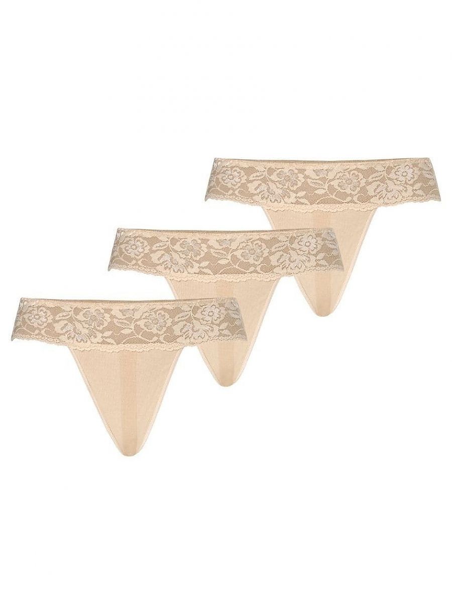 Trójpak seksownych stringów koronkowych w kolorze naturalnego beżu. Wykonane są z elastycznej koronki o efektownym wzorzystym motywie kwiatowym, która zdobi stringi w okolicach bioder, idealnie przylegając. Wielopak stringów to propozycja dla panów chcących sprawić przyjemność swojej wybrance. Z przodu stringi w okolicach kroku wykończone są delikatną kształcie trójkąta. Taki zestaw stringów powinna posiadać każda kobieta w swojej garderobie.