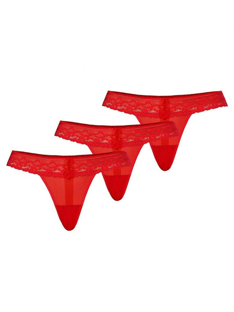 Zestaw damskich stringów, seksownych i kuszących męskie oko, w kolorze soczystej czerwieni. Trójpaki czerwonych stringów są często nabywane przez mężczyzn dla swoich wybranek na takie okazje jak Walentynki. Stringi w wielopaku wykonane są z efektownej, delikatnej siatki z dodatkiem elastycznej koronki, która oplata biodra.