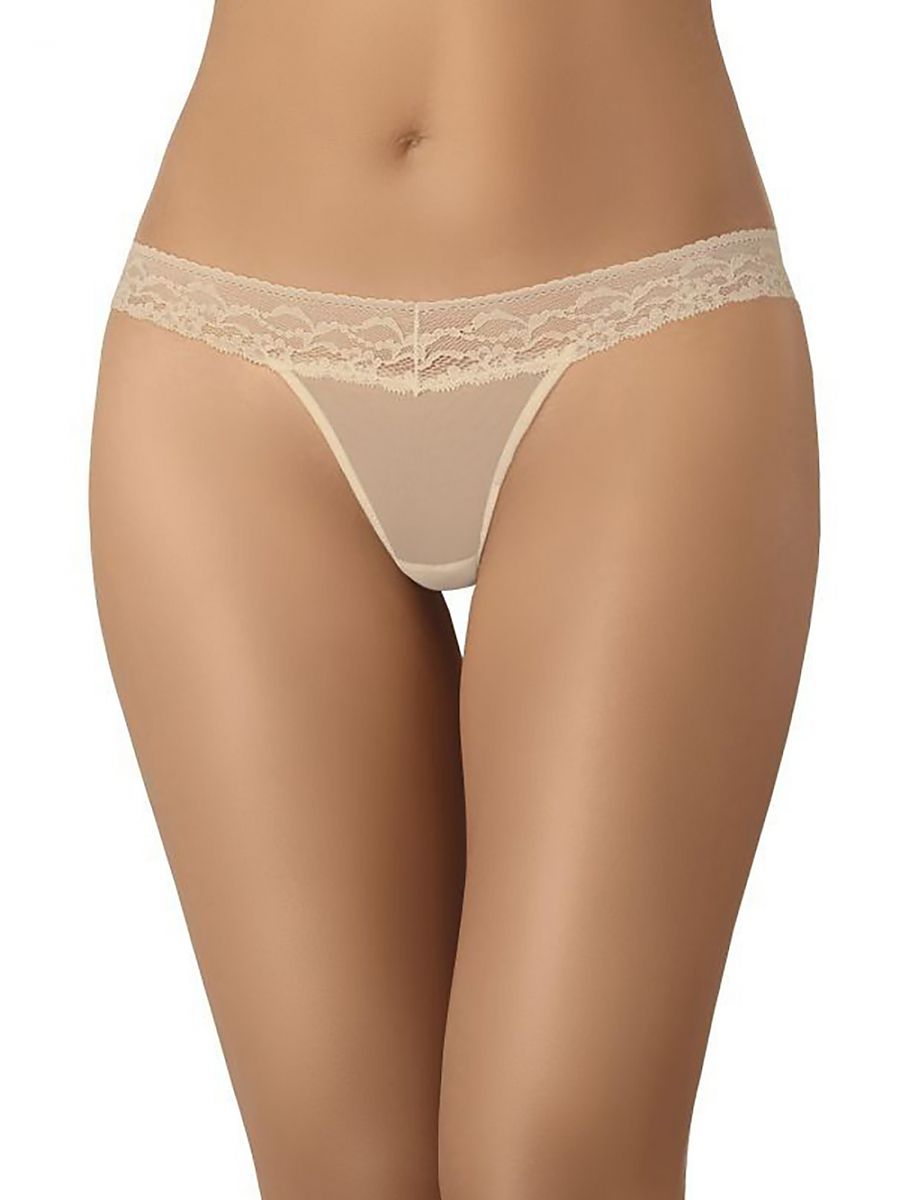 Stringi damskie w kolorze beżowym. Wykonane są z wysokiej jakości siateczki, połączonej z elegancką koronką wszytą w pasie. Są głęboko wycięte na udach, co optycznie wydłuża nogi. Siateczka zarówno z przodu, jak i z tyłu jest bardzo delikatna, a cienki paseczek z tyłu jest bardzo przyjemny dla kobiecego ciała. W środku od wewnątrz stringi z koronki podszyte są bawełną, która pozwala zachować świeżość oraz komfort w ciągu dnia. Stringi koronkowe są zmysłowe, idealne na co dzień, a także na specjalne okazje. Prane w odpowiedniej temperaturze nie zmieniają swojego kształtu, nie mechacą się ani nie kulkują. Majteczki idealne dla każdej kobiety.
