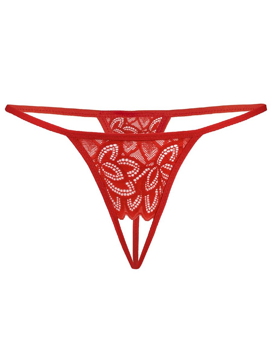 Seksowne skąpe stringi koronkowe w kolorze czerwonym. Wykonane są z wysokiej jakości elastycznej i eleganckiej koronki, miłej i delikatnej w dotyku i dla kobiecego ciała. Stringi są bardzo skąpe i posiadają w kroku otwór. Z przodu majtki damskie wykonane są z koronki, która jest w kształcie trójkąta, od tego biegnie otwór. Z tyłu również znajduje się mały koronkowy trójkącik, który jest przedłużeniem do cienkiego paska, który chowa się między pośladkami i odsłania je w całości. Pasek jest delikatny, elastyczny, nie ociera, nie zostawia śladów na skórze, dlatego też stringi są wygodne. Wokół bioder biegnie również cienki pasek, który podtrzymuje stringi, jest również delikatny, nie przecina w pasie, nie zostawia śladów. Majtki z otwartym krokiem z uwagi na piękną, elastyczną i elegancką koronkę są bardzo efektowne i niezwykle kuszące dla męskiego oka. Stringi z otwartym krokiem są niewidoczne spod dopasowanej odzieży. Są adresowane do kobiet kochających skąpą i seksowną bieliznę. Zestawione z kusą prześwitującą koszulką na cienkich ramiączkach, stringi otwarte tworzą zestaw, który umili wieczór we dwoje.