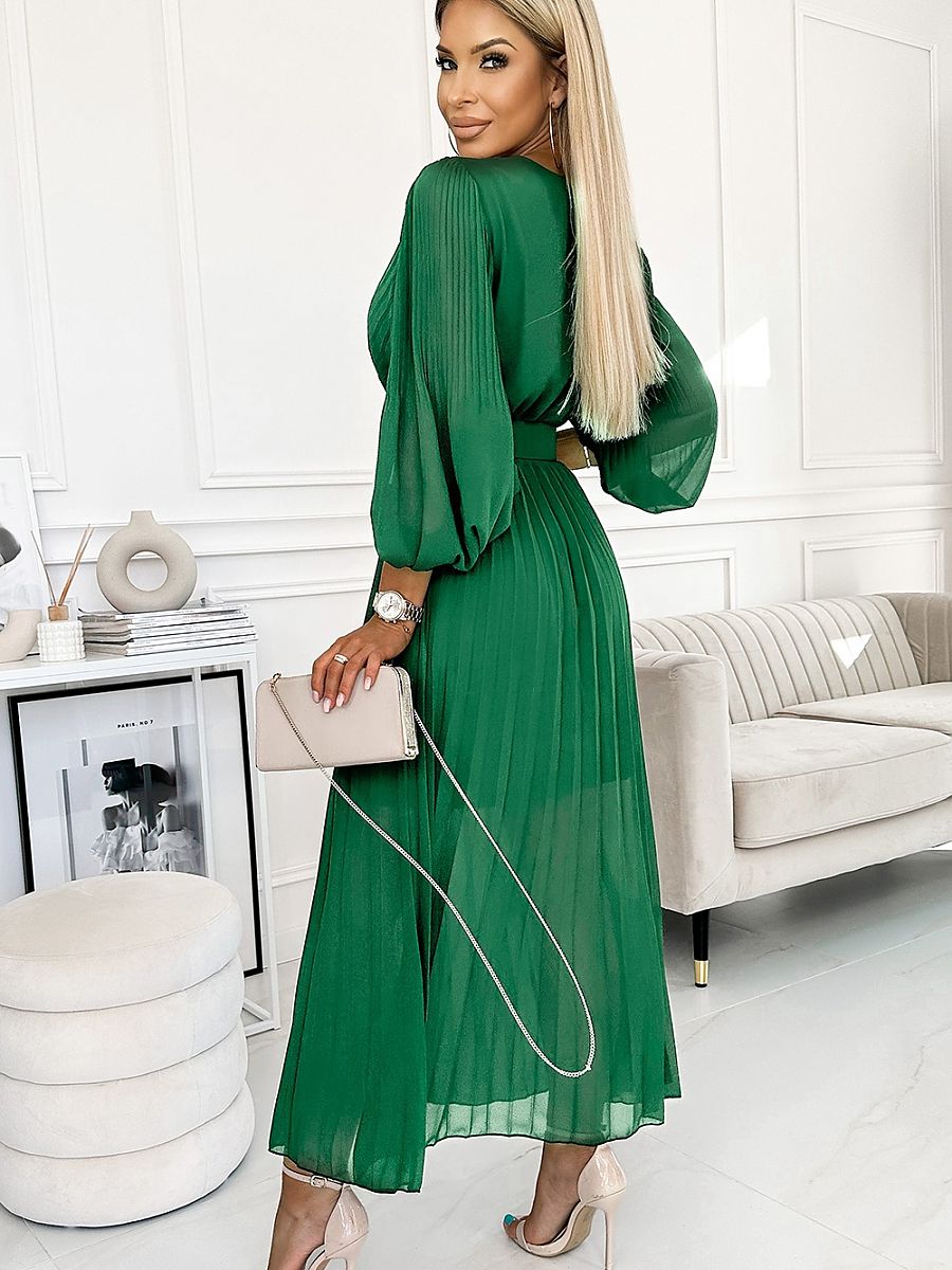 Plisowana szyfonowa sukienka z dekoltem, długim rękawkiem i paskiem. Plisowanie na dekolcie i rękawku dodaje sukience elegancji. Sukienka w kolorze jasnej zieleni. Marka numoco.