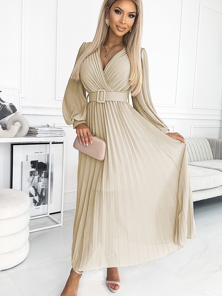 Plisowana szyfonowa sukienka z dekoltem, długim rękawkiem i paskiem. Plisowanie na dekolcie i rękawku dodaje sukience elegancji. Sukienka w kolorze beżowym. Marka numoco.