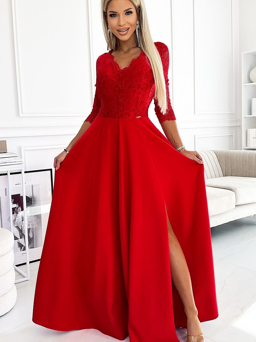 Długa, elegancka, koronkowa, maxi suknia z dekoltem. Pięknie wyprofilowany dekolt i rozcięcie na spódnicy tworzy niecodzienną kreację w kolorze czerwonym. Sukienka idealna na wesele, Sylwestra, karnawał, studniówkę i inne ważniejsze imprezy. Produkcja polska. Marka Numoco.