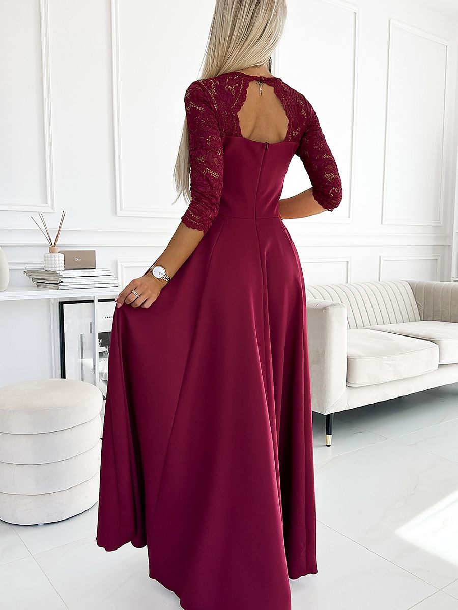 Elegancka, długa, maxi suknia z koronkowym dekoltem. Rozcięcie na spódnicy wraz z koronkową górą tworzą niecodzienną kreację w kolorze bordowym. Produkcja polska. Marka Numoco.