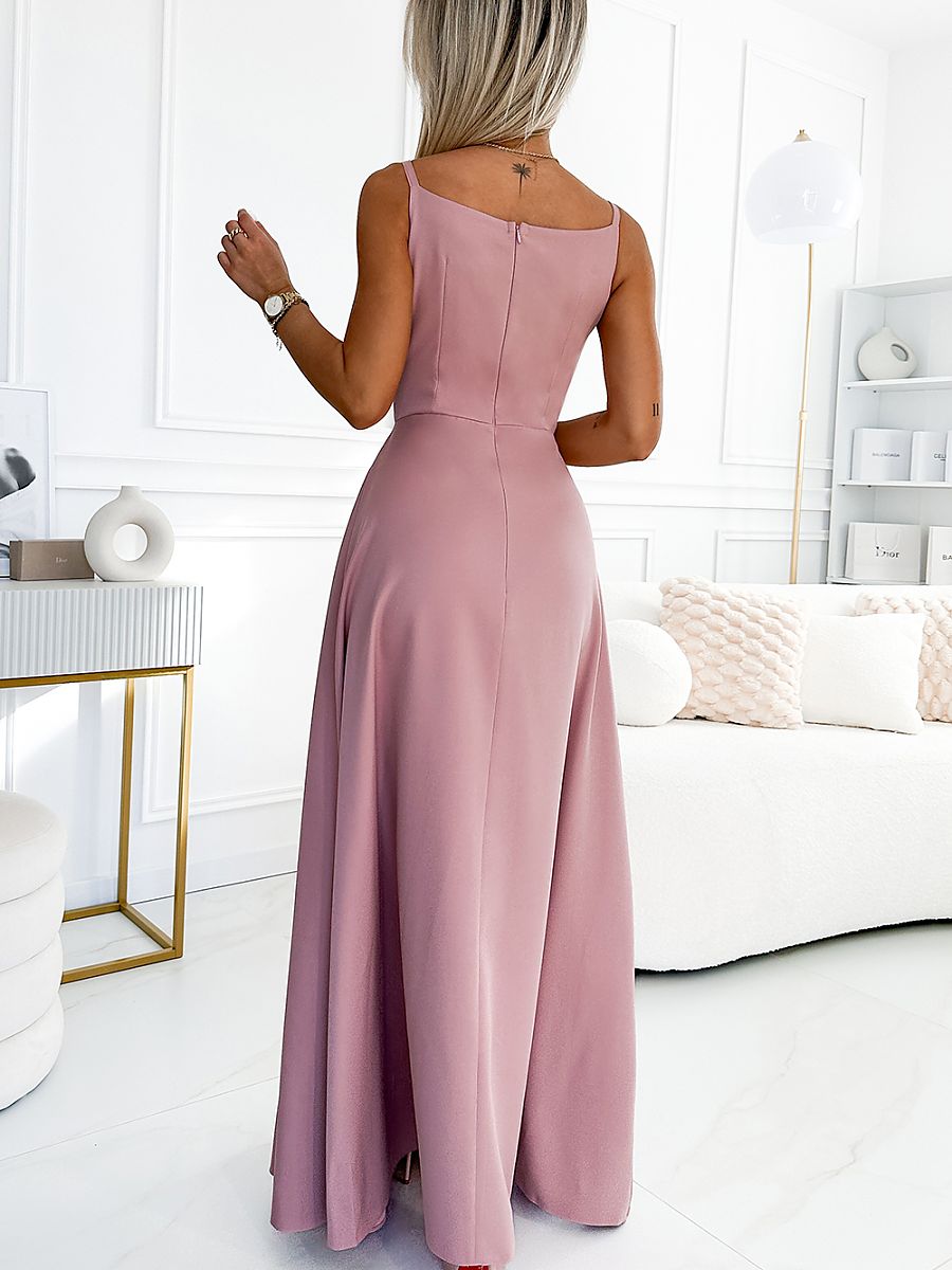 Elegancka maxi suknia na ramiączkach. Pięknie wyprofilowany dekolt i rozcięcie na spódnicy tworzy niecodzienną kompozycję. Sukienka w kolorze brudnego różu. Produkcja polska. Marka Numoco.