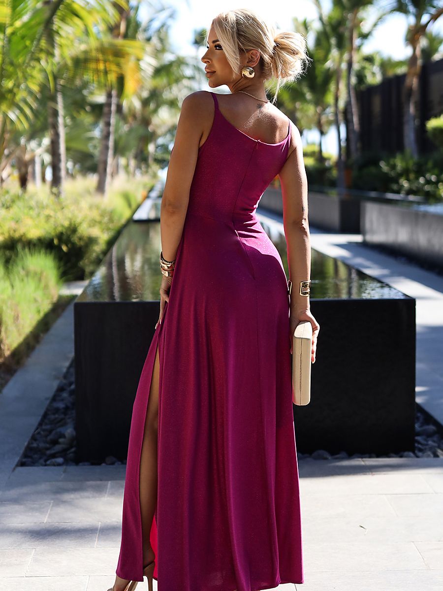 Elegancka maxi długa błyszcząca suknia na ramiączkach. Pięknie wyprofilowany dekolt i rozcięcie na spódnicy tworzy niecodzienną kompozycję. Uszyta z brokatowego, elastycznego materiału w kolorze fuksji. Sukienka idealna na wesela, sylwestra, studniówkę, karnawał i inne ważniejsze wyjścia. Produkcja polska. Marka Numoco.