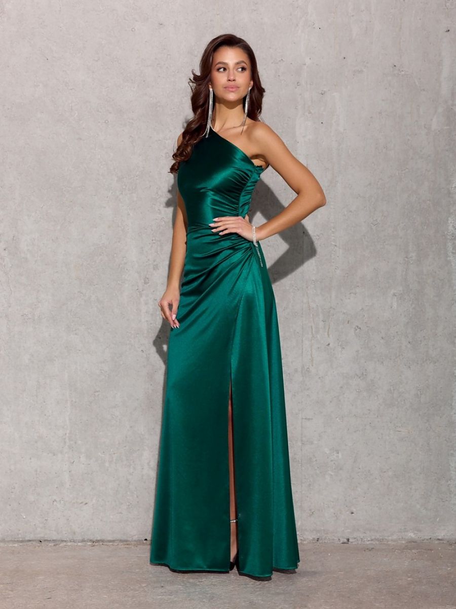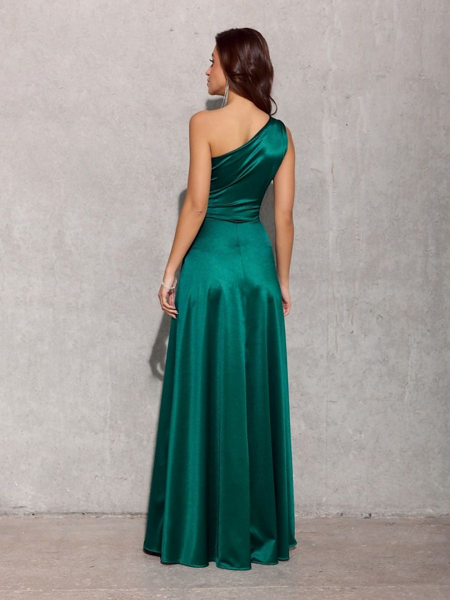 Sukienka Inez została wykonana z przyjemnej, lejącej tkaniny satynowej, która dodaje szyku i elegancji. Sukienka wyróżnia się ciekawym dekoltem odsłaniającym jedno ramię, dzięki zastosowaniu szerokiego ramiączka z marszczeniami. Idealne dopasowanie w talii oraz długa, zwiewna spódnica z rozcięciem na nogę perfekcyjnie podkreślą atuty sylwetki. Sukienka Inez gwarantuje dostojny i elegancki wygląd poprzez swój klasyczny krój wzbogacony o oryginalny dekolt na jedno ramię. Elegancki fason sukienki przełamany odsłoniętym ramieniem i seksownym rozcięciem na nogę przykuwa uwagę i podkreśla sylwetkę. Sukienka sprawdzi się na wyjątkowe okazje, takie jak: wesele, komunia, studniówka, impreza firmowa.