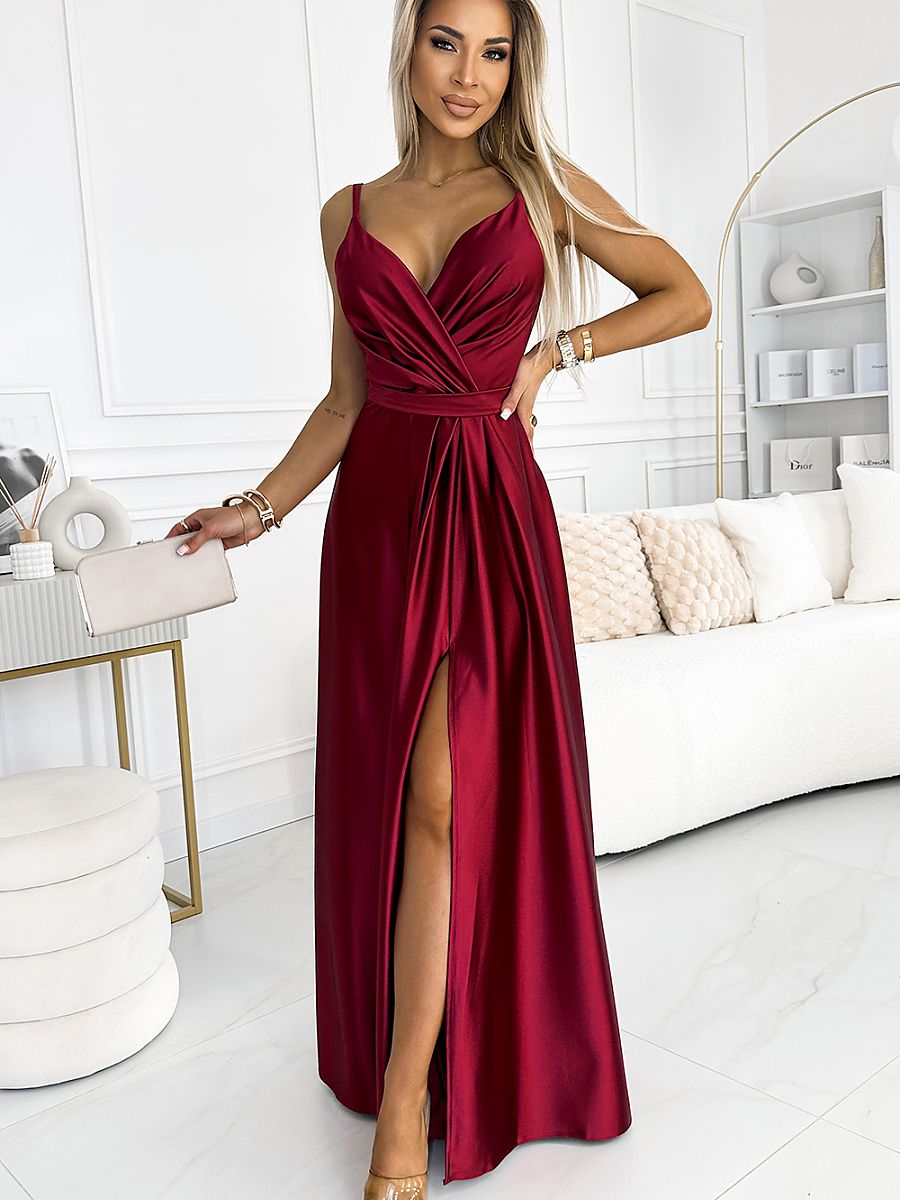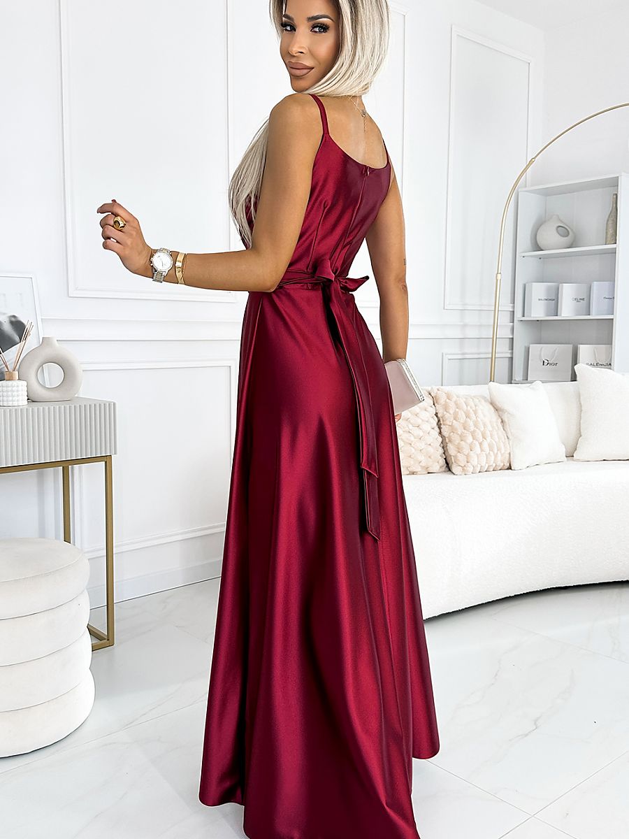 Elegancka maxi długa satynowa suknia z rozcięciem na nogę i paskiem. Pięknie wyprofilowany dekolt i rozcięcie na spódnicy tworzy niecodzienną kompozycję. Uszyta z połyskującej, gładkiej, lekko elastycznej satyny w kolorze bordowym. Sukienka idealna na wesela, sylwestra, studniówkę, karnawał i inne ważniejsze wyjścia. Produkcja polska. Marka Numoco.