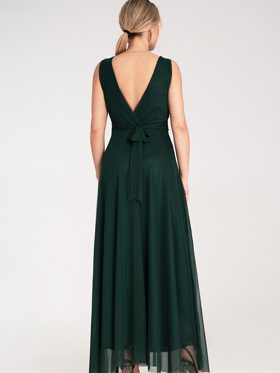 Sukienka maxi bez rękawów z kopertowym dekoltem z przodu i głębokim wycięciem na plecach. Góra delikatnie marszczona, z szerokim pasem pod biustem. Tył wiązany w kokardę.