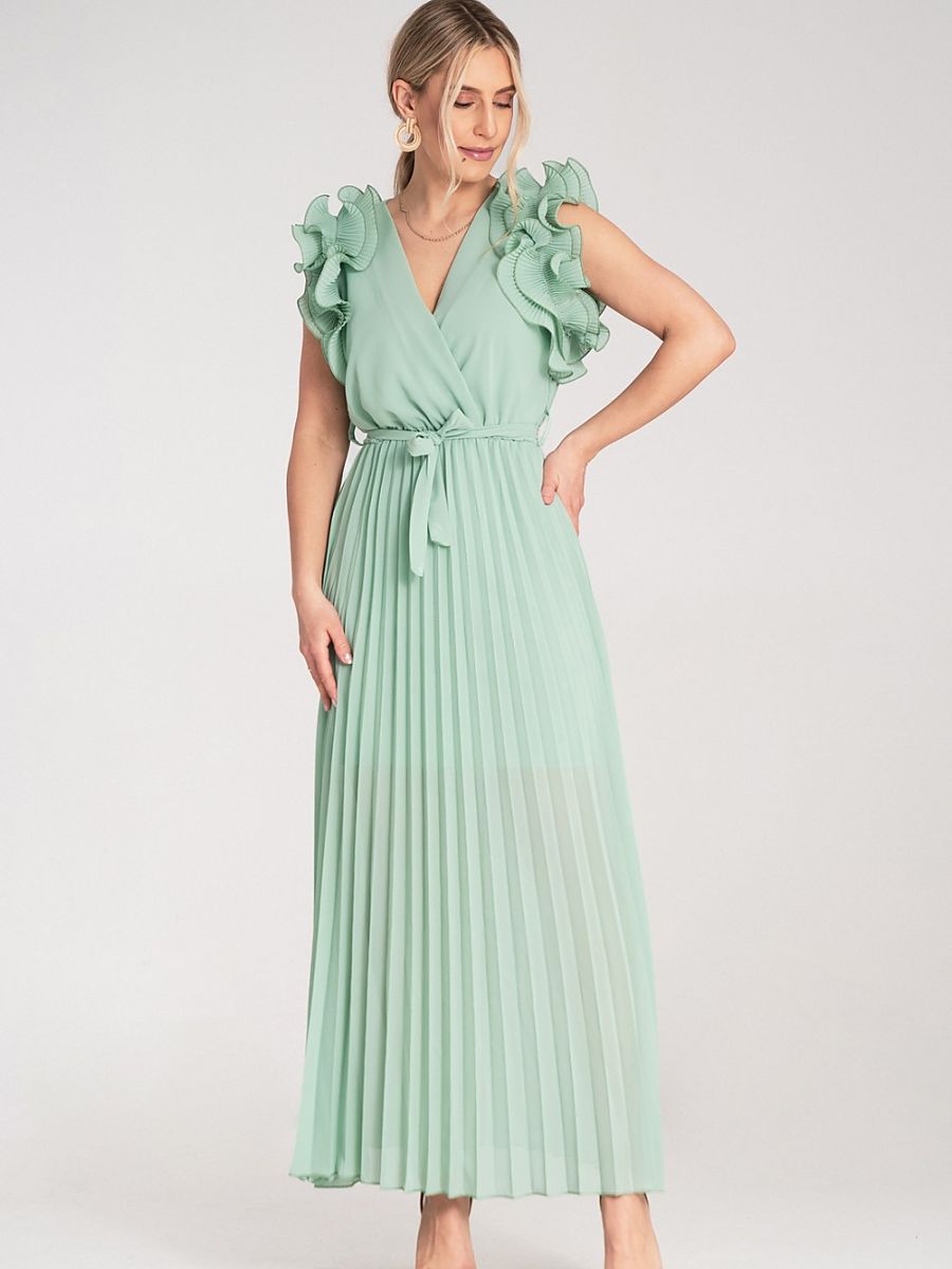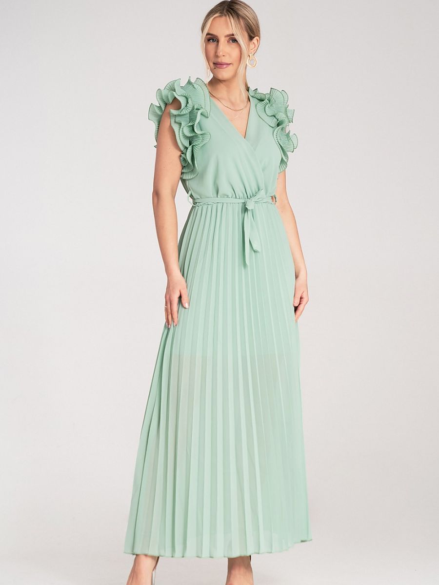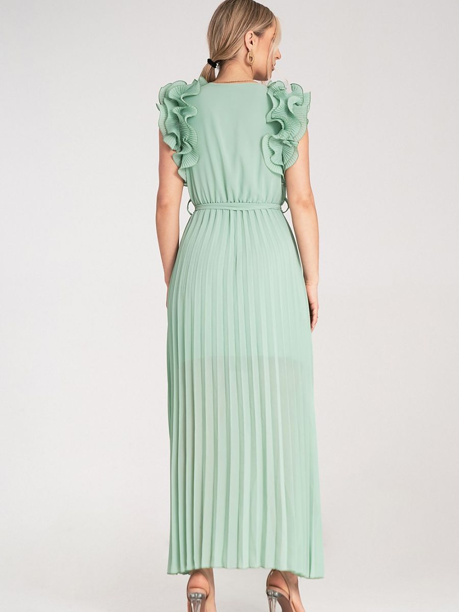 Sukienka maxi z kopertowym dekoltem i dekoracyjnymi, podwójnymi falbanami na ramionach. W talii wszyta gumka i materiałowy pasek do wiązania. Dół długi, z drobnymi plisami, uszyty z lekkiej, półprzezroczystej tkaniny.