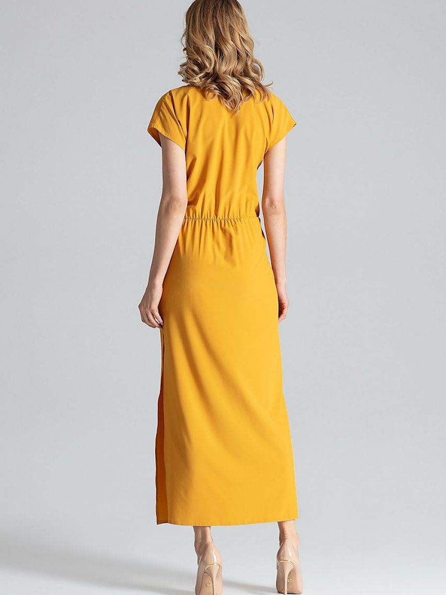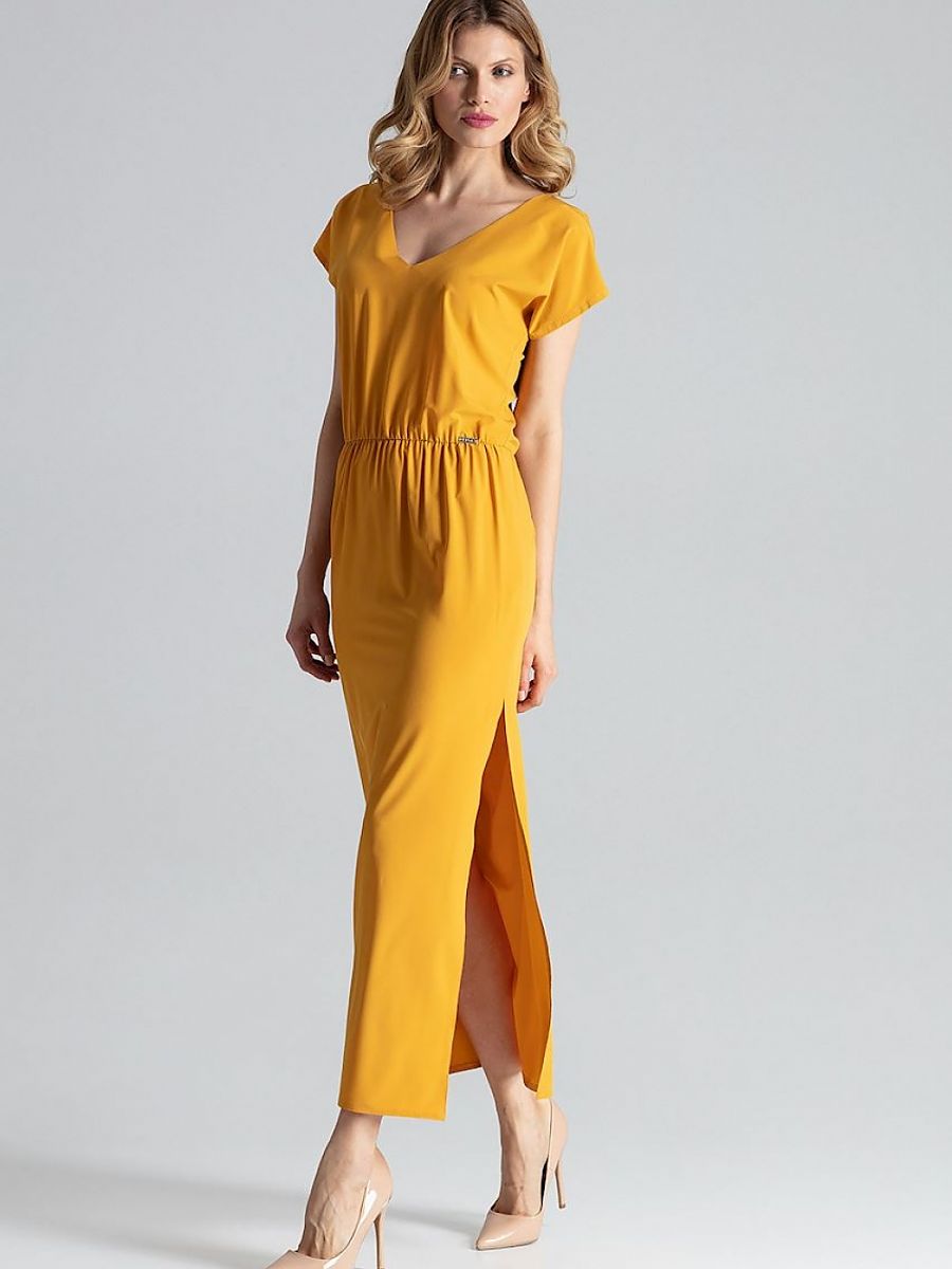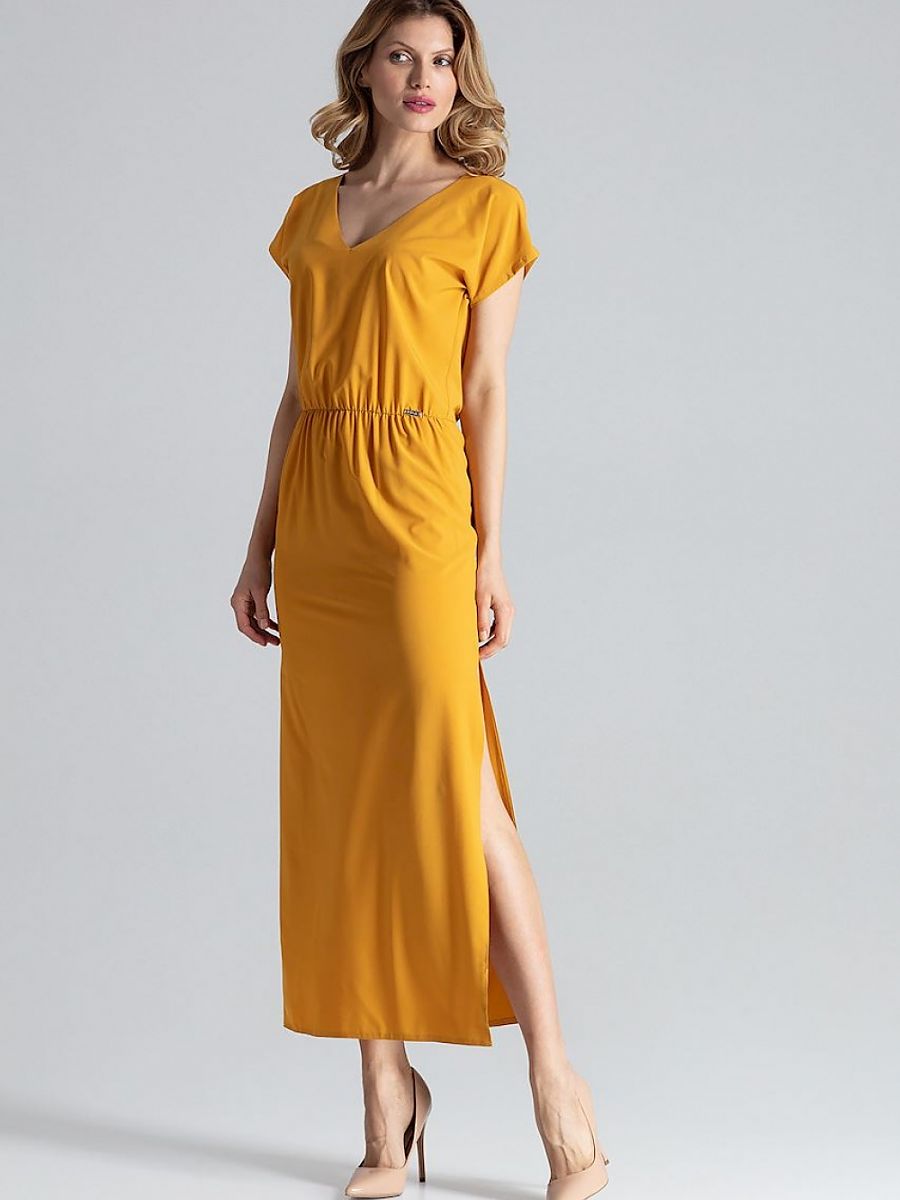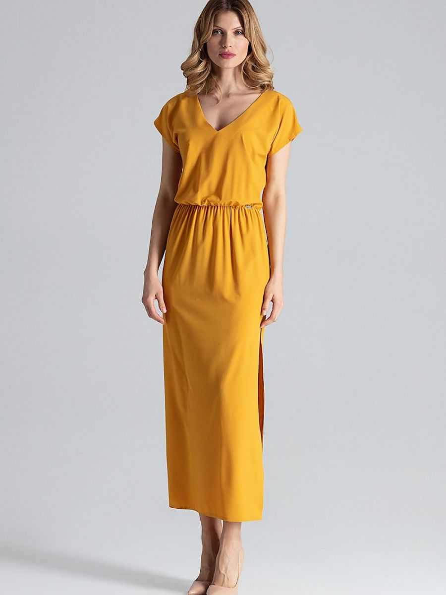 Długa, lekka i zwiewna sukienka z dekoltem w kształcie litery V z krótkim rękawem. Rozcięcie z lewej strony, w pasie wszyta gumka.
