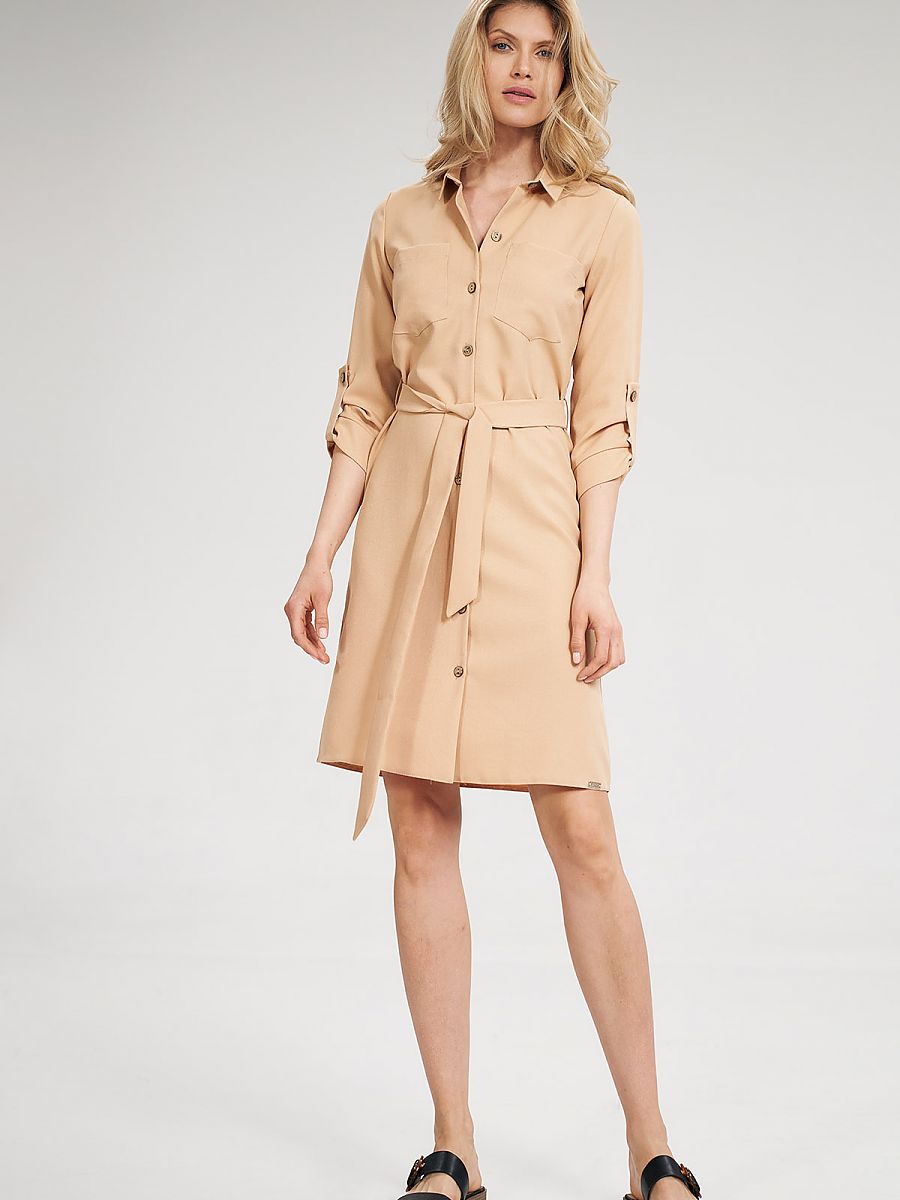 Beżowa długa koszulowa sukienka z podpinanym rękawem 3/4. Na wysokości biustu naszywane kieszenie. Zapinana z przodu na guziki, wiązana w pasie.