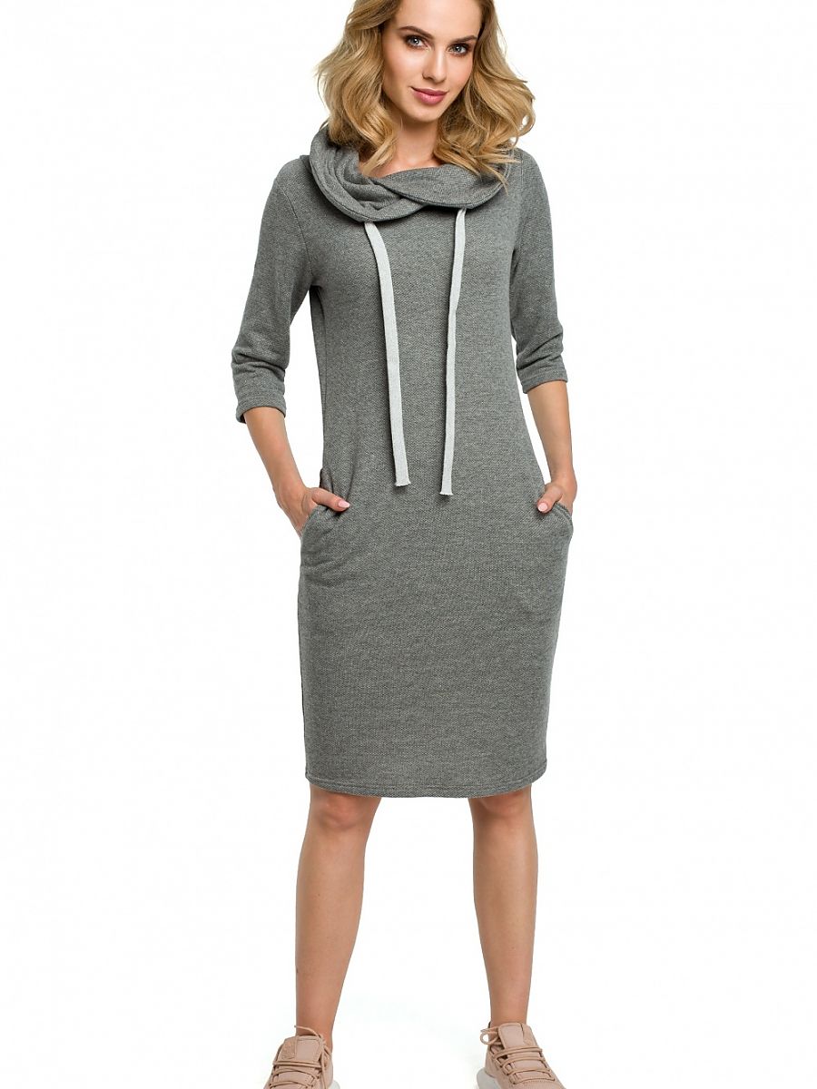 Niezwykle miękka dzianina, fason podkreślający talię i szeroki wykładany kołnierz ze sznurem umożliwiającym modelowanie kołnierza. To idealna sukienka na co dzień.