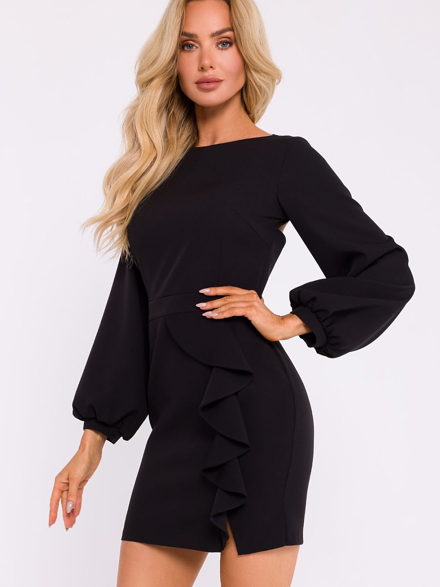 Stylowa mini sukienka uszyta z jednokolorowej tkaniny, idealna na wyjątkowe okazje. Odcinana w pasie, podkreśla talię, a doszyta na boku falbana dodaje jej subtelnej lekkości i kobiecego wdzięku. Dekolt pod szyję nadaje sukience elegancji, a wycięcie na plecach delikatnie odsłania skórę, dodając nuty zmysłowości. Sukienka zapinana jest na guzik oraz kryty zamek sięgający do połowy pleców, co zapewnia komfortowe dopasowanie. Długie bufiaste rękawy zakończone mankietami dodają jej wyjątkowego charakteru. Model bez podszewki, zaprojektowany i uszyty w Polsce.