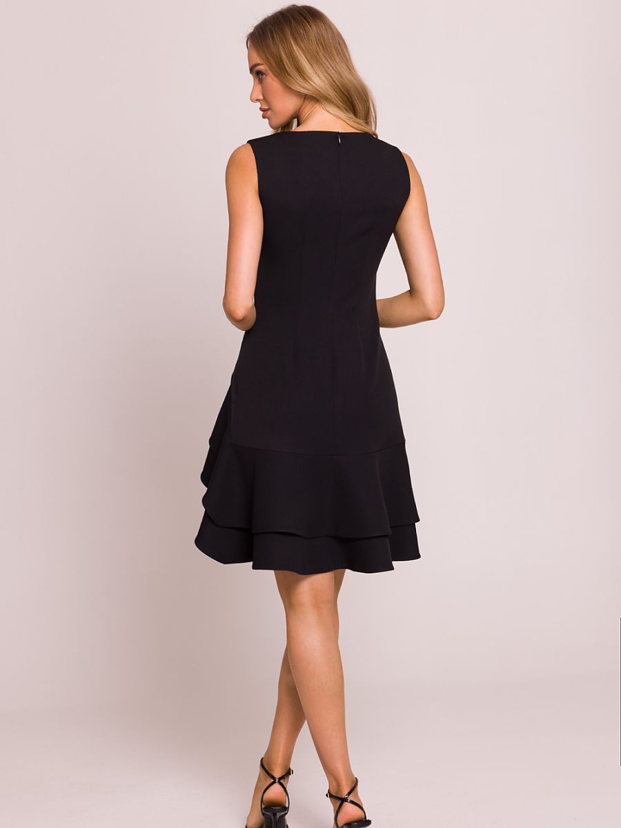 Elegancka, dopasowana sukienka bez rękawów, wykonana z wysokiej jakości tkaniny. Model zachwyca asymetrycznym dołem z dwiema falbanami, które dodają lekkości i dynamicznego charakteru. Wysokie wycięcie na nogę subtelnie podkreśla sylwetkę, a klasyczny okrągły dekolt nadaje całości harmonii. Sukienka zapinana jest z tyłu na kryty zamek, co zapewnia idealne dopasowanie. Brak podszewki sprawia, że jest lekka i komfortowa w noszeniu. Zaprojektowana i uszyta w Polsce z dbałością o każdy detal.