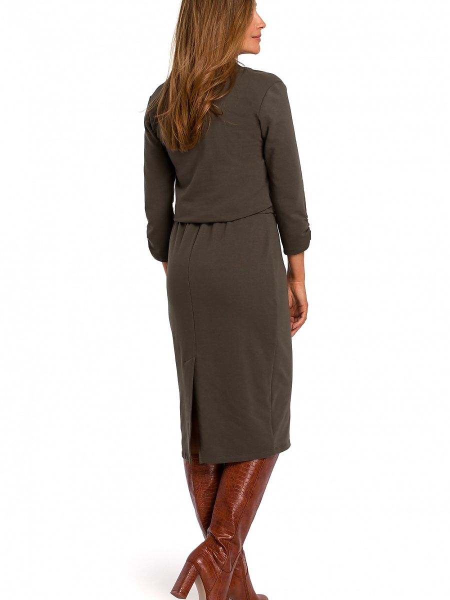 Ta wyjątkowa sukienka o klasycznym kroju, z dekoltem i gumką w talii uszyta została z dzianiny bawełnianej dzięki czemu poczujesz się w niej swobodnie i komfortowo nawet po całym dniu w pracy.