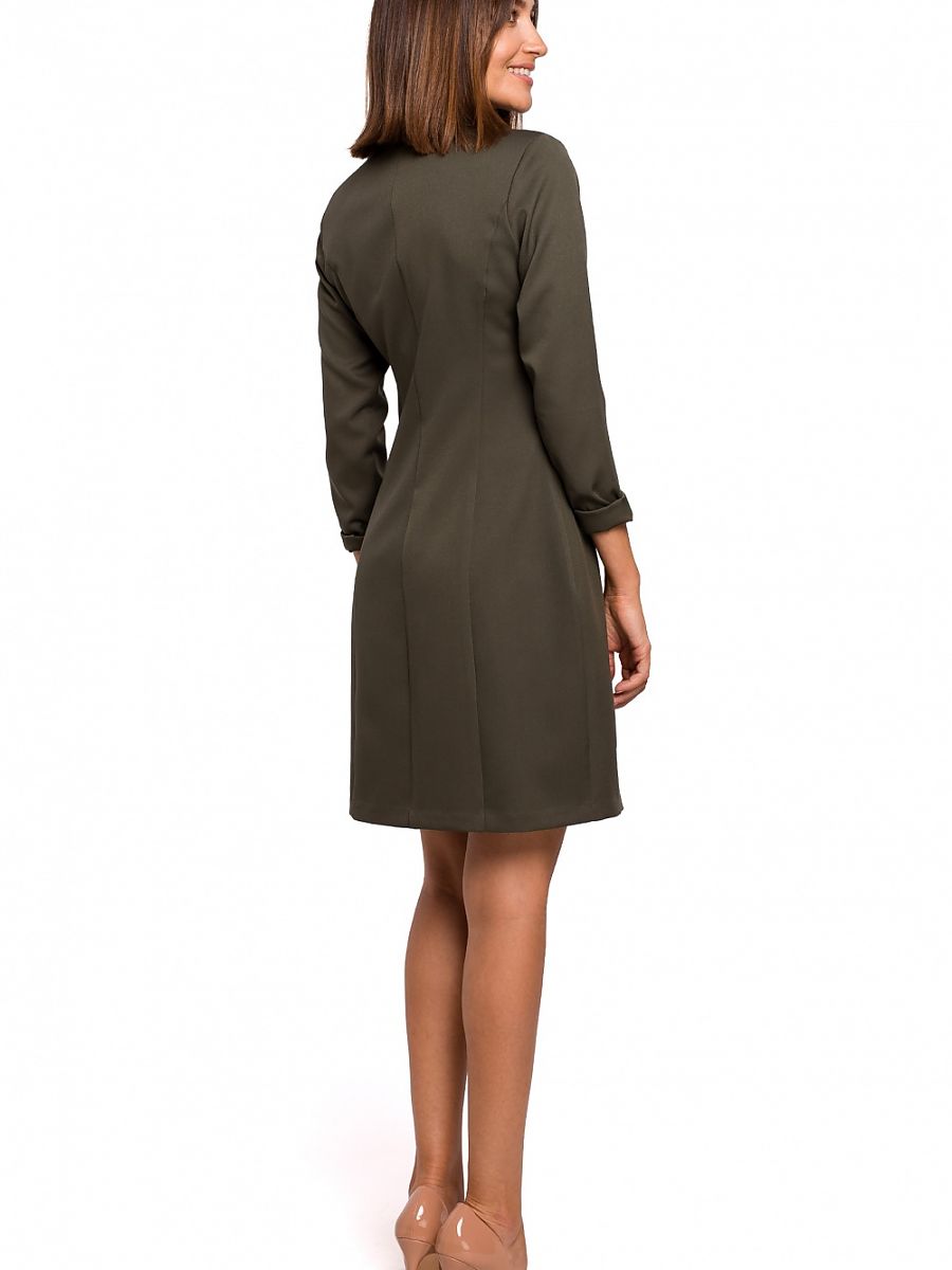 Minimalizm to esencja kobiecości. Ta niebanalna sukienka o kroju żakietowym zapinana na jeden guzik to ma. Sukienka z przodu zapinana na ozdobny guzik, w środku zapinana na dodatkowy guzik. Sukienka bez podszewki.