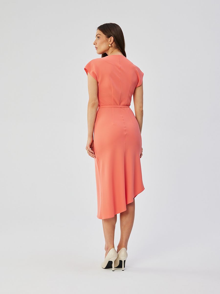 Sukienka, stworzona z dbałością o szczegóły, to wyjątkowy element garderoby, zaprojektowany i uszyty w Polsce, co świadczy o wysokiej jakości i lokalnym charakterze. Jej ołówkowy krój, krojony ze skosu, nadaje całości nowoczesnego i eleganckiego wyglądu. Dekolt typu woda dodaje sukience subtelności, podkreślając delikatnie odsłoniętą klatkę piersiową. Krótkie rękawy nietoperzowe wprowadzają do stylizacji lekkość i oryginalność. Asymetryczny dół sukienki dodaje jej charakteru i sprawia, że jest ona idealna na różne okazje. Długość midi nadaje sukience uniwersalność, pozwalając na noszenie jej zarówno w codziennych, jak i bardziej formalnych sytuacjach. Zamek kryty na boku ułatwia zakładanie i zdejmowanie sukienki, jednocześnie zachowując jej elegancki wygląd. Brak podszewki sprawia, że tkanina delikatnie układa się na ciele, zachowując lekkość i swobodę. Do sukienki dołączony jest pasek z klamerkami, który pozwala na podkreślenie talii i dostosowanie jej do indywidualnych preferencji. To nie tylko modny element garderoby, ale również wyraz wsparcia dla rodzimej produkcji i designu.