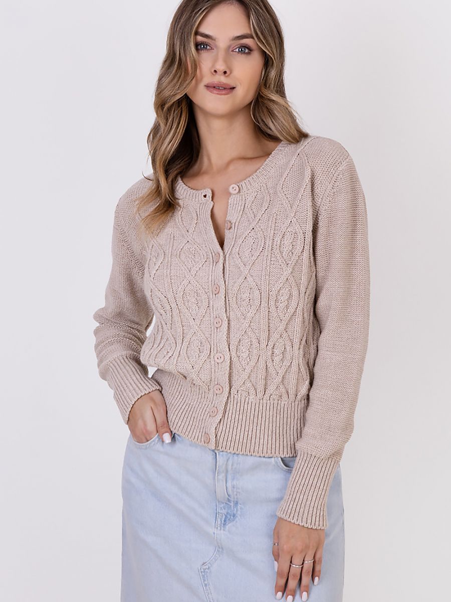 Ten elegancki kardigan sięgający linii bioder to idealny wybór na zarówno na co dzień, jak i na bardziej oficjalne okazje. Sweter posiada okrągły dekolt, który dodaje mu klasycznego uroku. Dodatkowo, ściągacze na rękawach zapewniają idealne dopasowanie. Wyjątkowe, dekoracyjne sploty nadają kardiganowi wyjątkowy charakter.